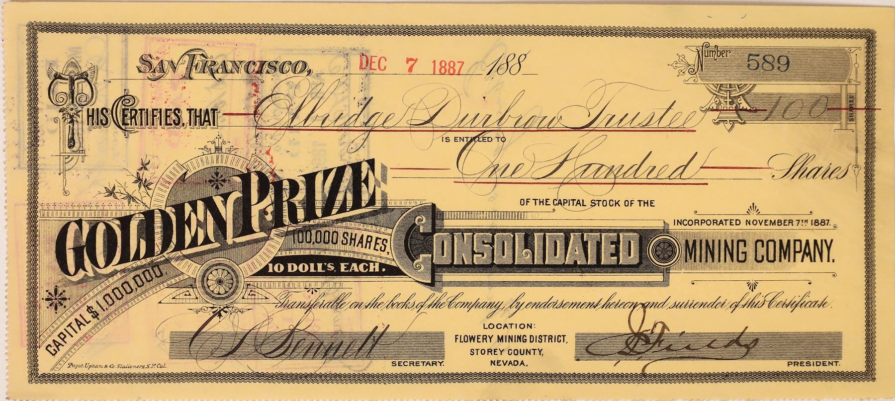 "Location: Flowery Mining District, Storey County, Nevada" printed at bottom center. Inc. in Nov. 1887. No. 589, issued to Elbridge Durbrow for 100 shares in 1887 in San Francisco. Signed by president Fields and secretary Bennet. Black border and print on yellow paper. Printed by Payot, Upham & Co., SF. 4 x 9" Pinholes. In the later 1880s, the Golden Prize was involved in litigation with the Lady Bryan Mining Company, the dominant mining property in the Flowery District. The Grand Prize owned the Dreadnaught Claim (E&MJ March 10th, 1888).