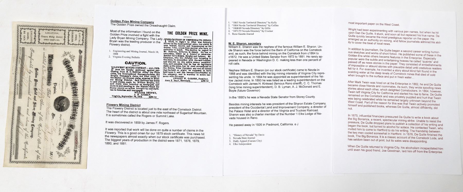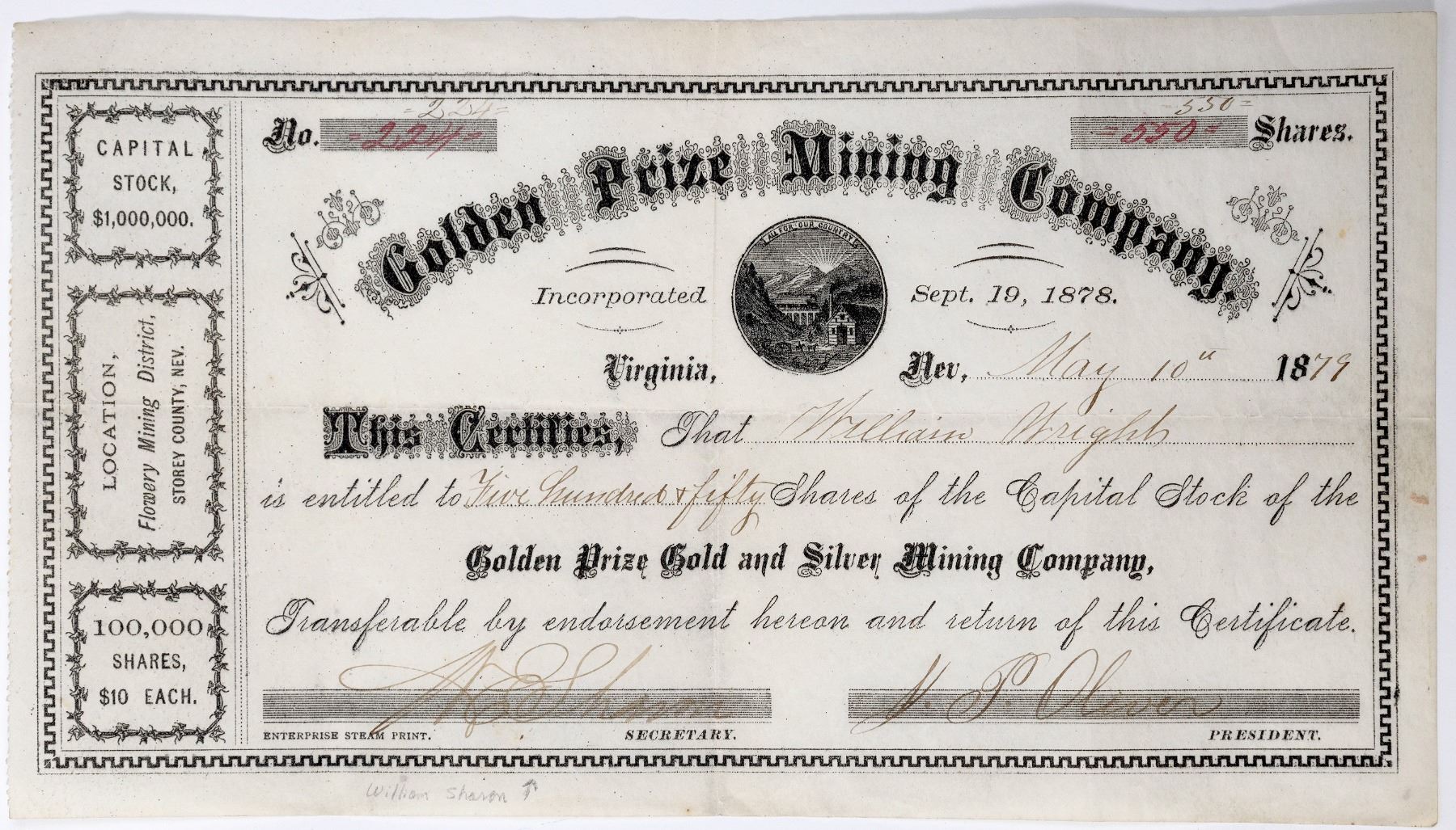 This is an intriguing piece for Nevada history collectors. First, this is a rare Comstock mining stock. Second, it is signed by William Sharon's nephew, who came to the Comstock and took over many of the operations for his uncle. Third, it may have been issued to famous Nevada author (and close friend of Mark Twain) William Wright, aka Dan de Quille. Location: Flowery Mining District, Storey County, Nev. (printed in the left border). Inc. Sept. 19th, 1878. No. 224, issued for 550 shares to William Wright on May 10th, 1879 in Virginia (City), Nevada. Not endorsed on the back by Wright. Signed by president Oliver and secretary W. E. Sharon. Not cancelled. Black border and print, small Nevada state seal vignette. Printed by Enterprise Steam Print. Deep folds, light wear. Located near the famous Lady Bryan and involved in a law suit with them. There was more than one William Wright on the Comstock. However, Dan de Quille, William Wright, was definitely still in Virginia City at the time of this certificate and was a noted expert on mining! The two other possibilities could be a soda manufacturer and a miner ñ not so probable. Lists pros and cons of all possibilities. Biography on the Wright's and Sharon. Short description of the mine and district.