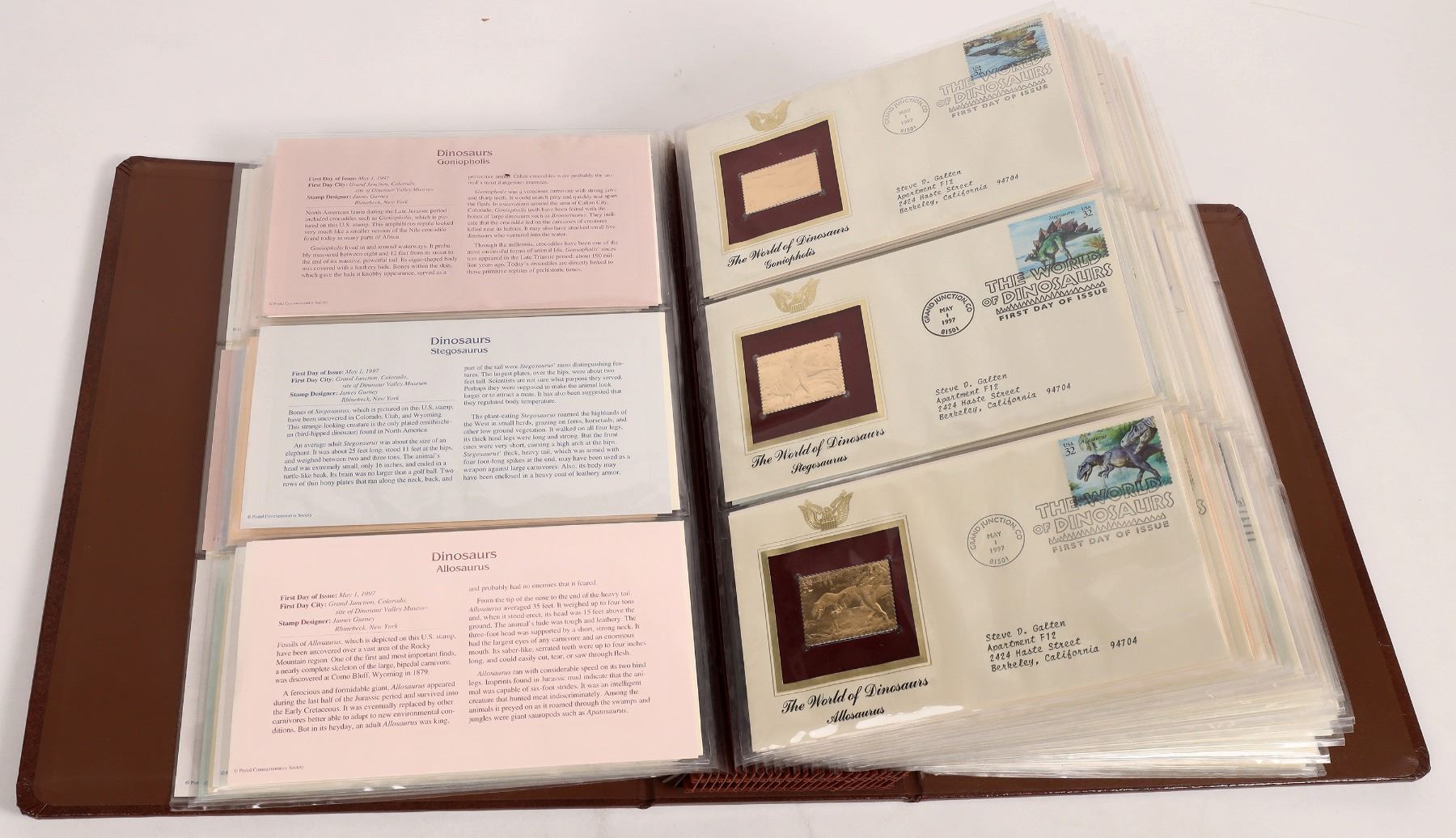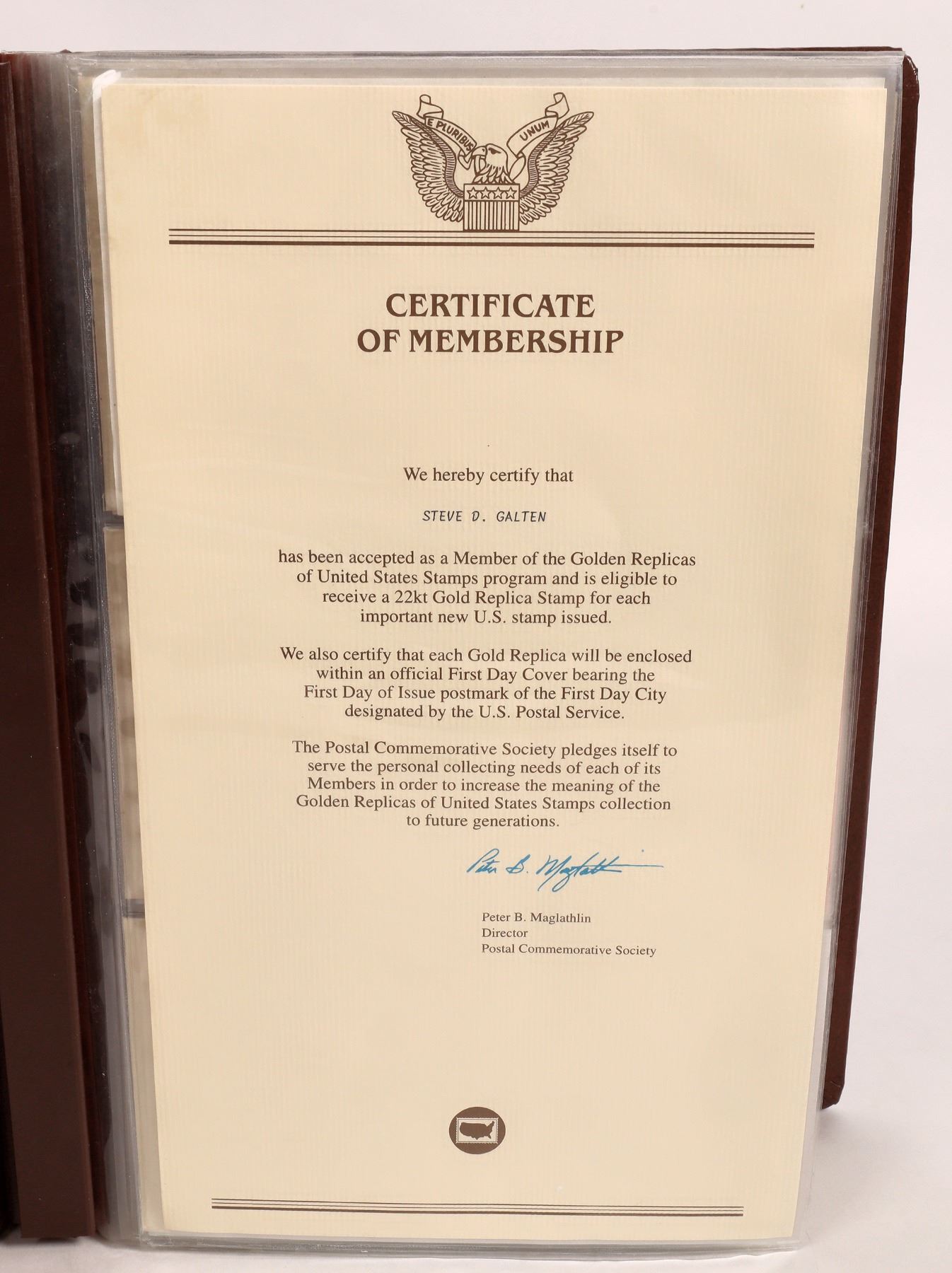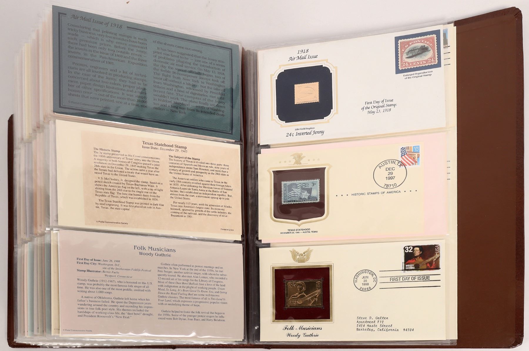 Postal Commemorative Society's Golden Replicas of the U.S. Stamp Program Collection. Each 22K Gold Replica Stamp is enclosed with an official First Day Cover bearing the First Day Issue Postmark of the First Day City designated by the U.S. Postal Service. This binder carries 74 Covers produced in 1997 and 1998.