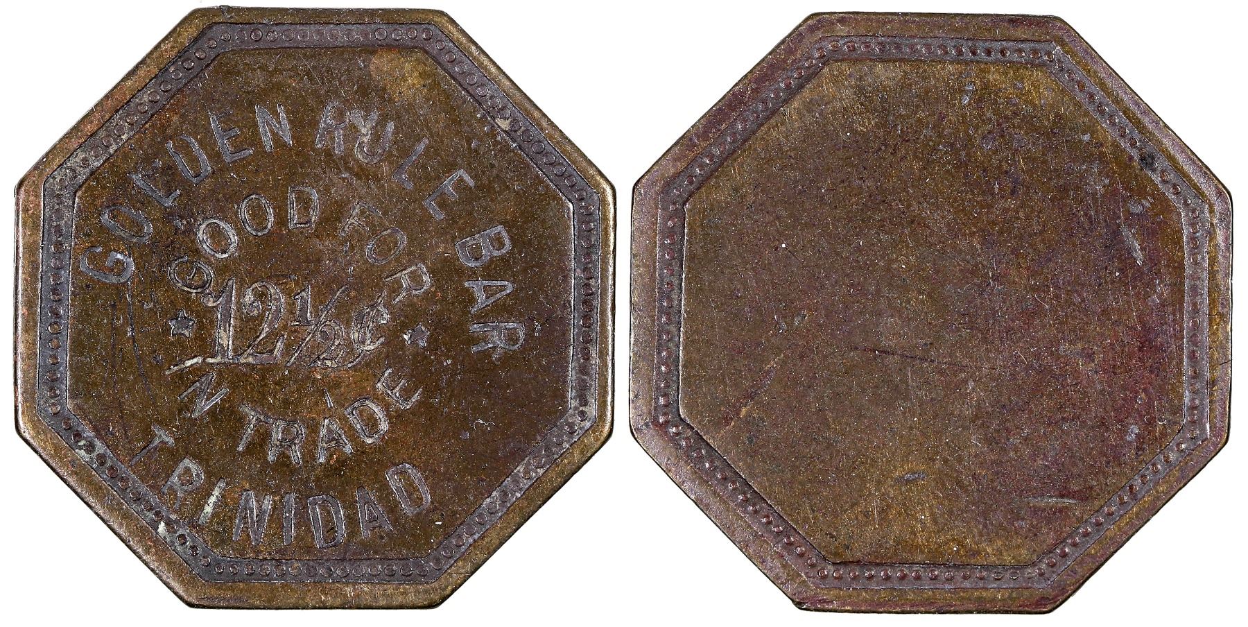 GOLDEN RULE BAR / GOOD FOR / 12Ω c / IN TRADE / TRINIDAD (all incuse) // (blank); Br., Octagonal, 26 mm.