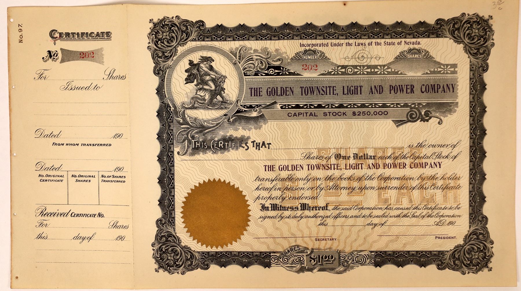 Golden Townsite, Light and Power Company Nev. Ghost Town Stock Certificate [127973]