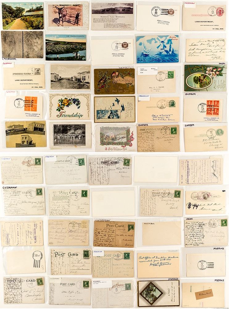 27 total postcards from seven different towns: Clara, Emory, Franklin, Barber, Cushman, Lavina and Irene. One postcard from Irene - post office only open from 1894-1915 (1912). Includes ten postal cards and one real photo postcard of a fowl and her eggs. Contains at least two different postmark cancels. (Svoboda Collection) City: Golden Valley County State: Montana Date: c1891-1971 HWAC# 35526