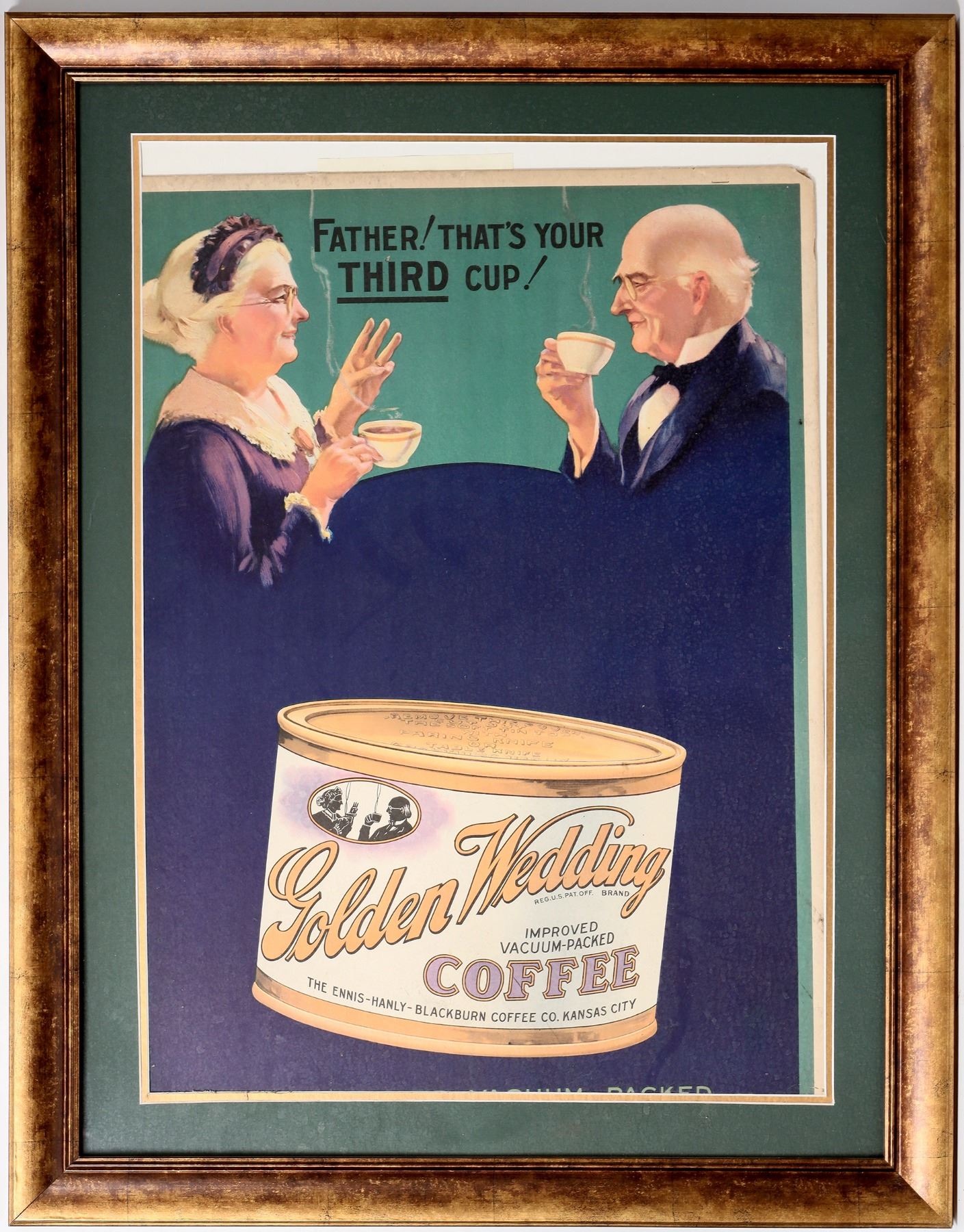 Wood framed advertising poster for Golden Wedding Coffee with an elderly couple sipping on some brew. Poster 27x20", frame 35.5x27.5". Poster has 1 staple, upper right corner chip.