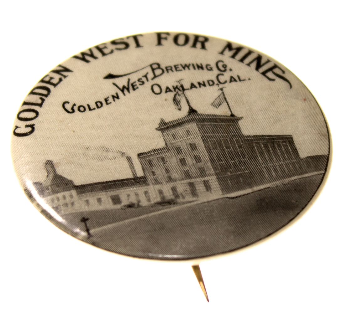Pre-Prohibition. "Golden West For Mine." Image of the brewing facility. 1.75" diameter. Rust on reverse. The Golden West Brewing Co. was located in West Oakland. It operated under various names from 1856 until 1959. The name Golden West Brewing Co. was adopted in 1911. [Ref:http://oaklandwiki.org/Golden_West_Brewing_Co.] Burt Collection