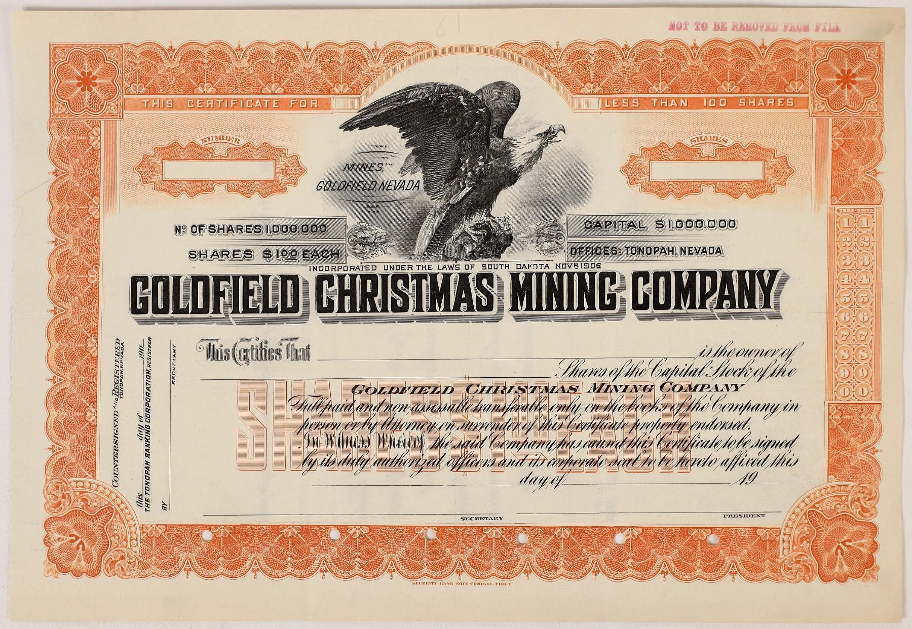 Specimen certificate engraved by Security Bank Note Company, Philadelphia. Although the certificate is not stamped, "Specimen", it clearly is as it is stamped at top right, "Not To Be Removed From File". The usual hole punches down near the signature line. The company incorporated in South Dakota in 1906. Printed on the certificate it states, "Mines at Goldfield, Nevada" and "Offices Tonopah, Nevada". EF.