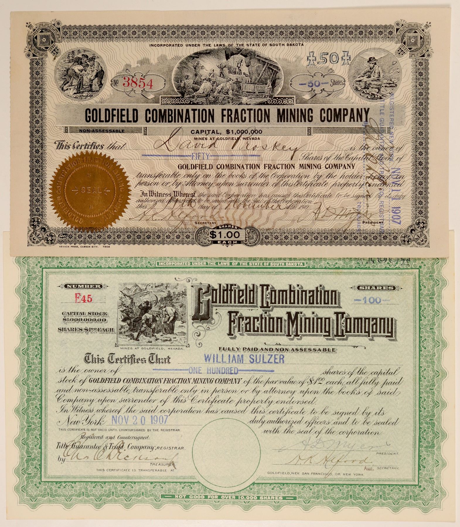 Lot of 2 different, both signed by AD Meyers as president. Meyers was one of the discovers of Goldfield and became a millionaire. Meyers and RC Hart discovered the rich Combination Lode in May 1903, reinvigorating interest in the area. The Combination Mine’s first shipments were made in December of 1903. In 1906, Francis Bosqui reported that, “The Combination mine, situated about one-half mile northeast of the town of Goldfield, consists of ten full claims and three fractions, aggregating 200 acres…at the very outset of its career as a gold producer, the Combination was blessed by the happiest accident that can befall a mine—it passed into good hands. It has been well administered; it has had the benefit of the most approved and practical methods in mining and metallurgy” (Rickard ed., Recent Cyanide Practice, 1907). 1) No. 3854, issued for 50 shares in 1907. Not cancelled. Black border and print, three mining vignettes. Folds. 2) No. E45, issued in 1907 for 100 shares. Not cancelled. Green border and background, mining vignette. Folds. Ken Prag Collection