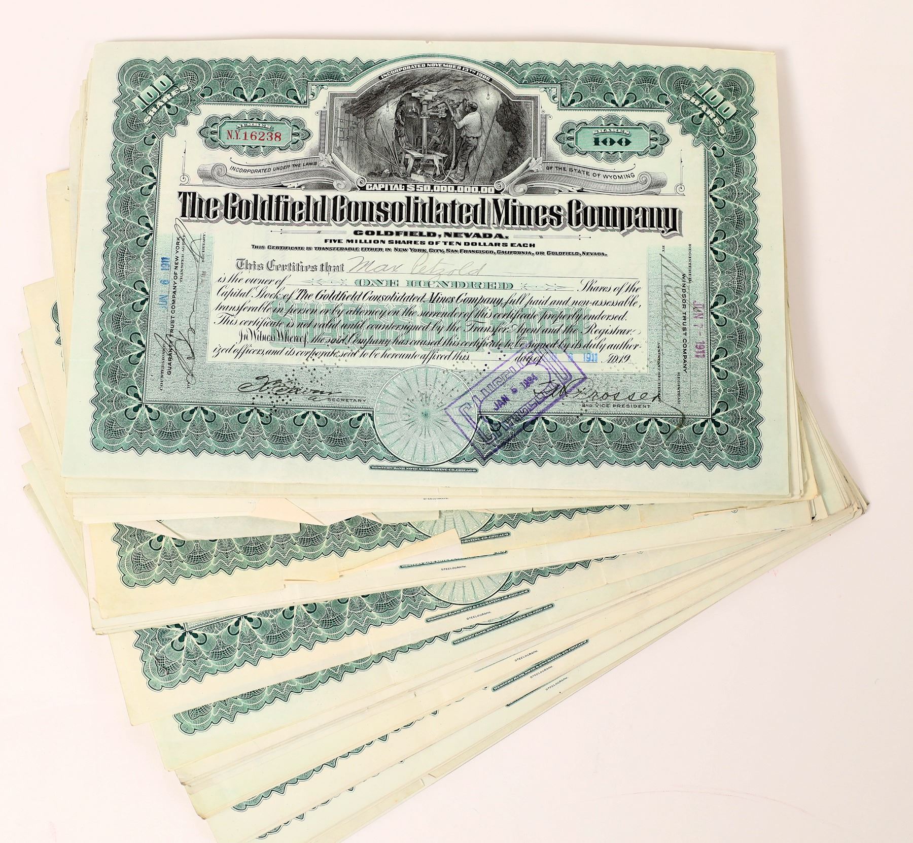 Lot of 100 issued stocks, 1911-1933. All have the same design: green border, black print, and mine drilling vignette. Punch and stamp cancelled. No Wingfield signatures.