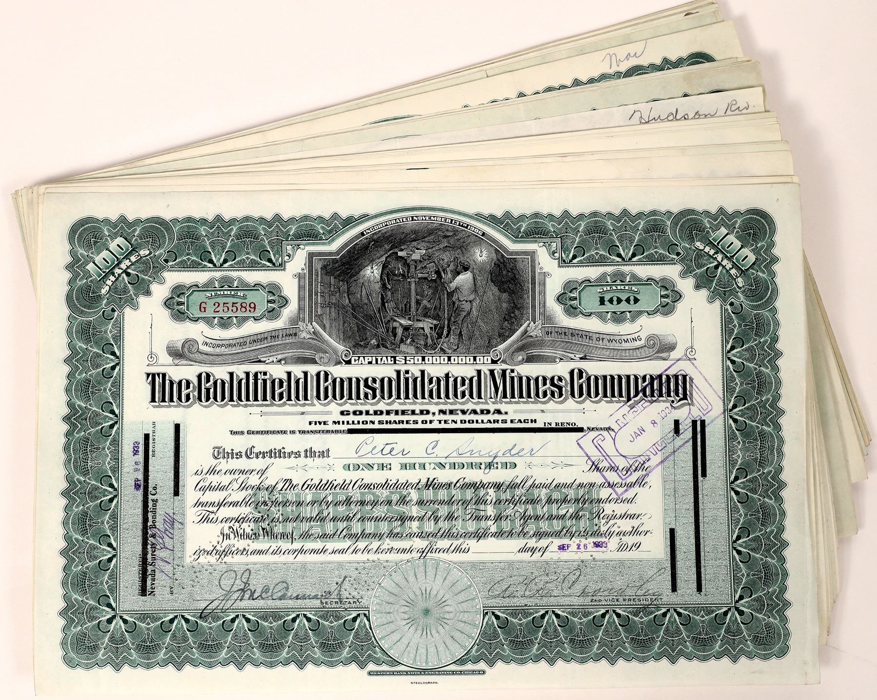 Lot of 100 issued stocks, 1910-1933. All have the same design: green border, black print, and mine drilling vignette. Punch and stamp cancelled. No Wingfield signatures.