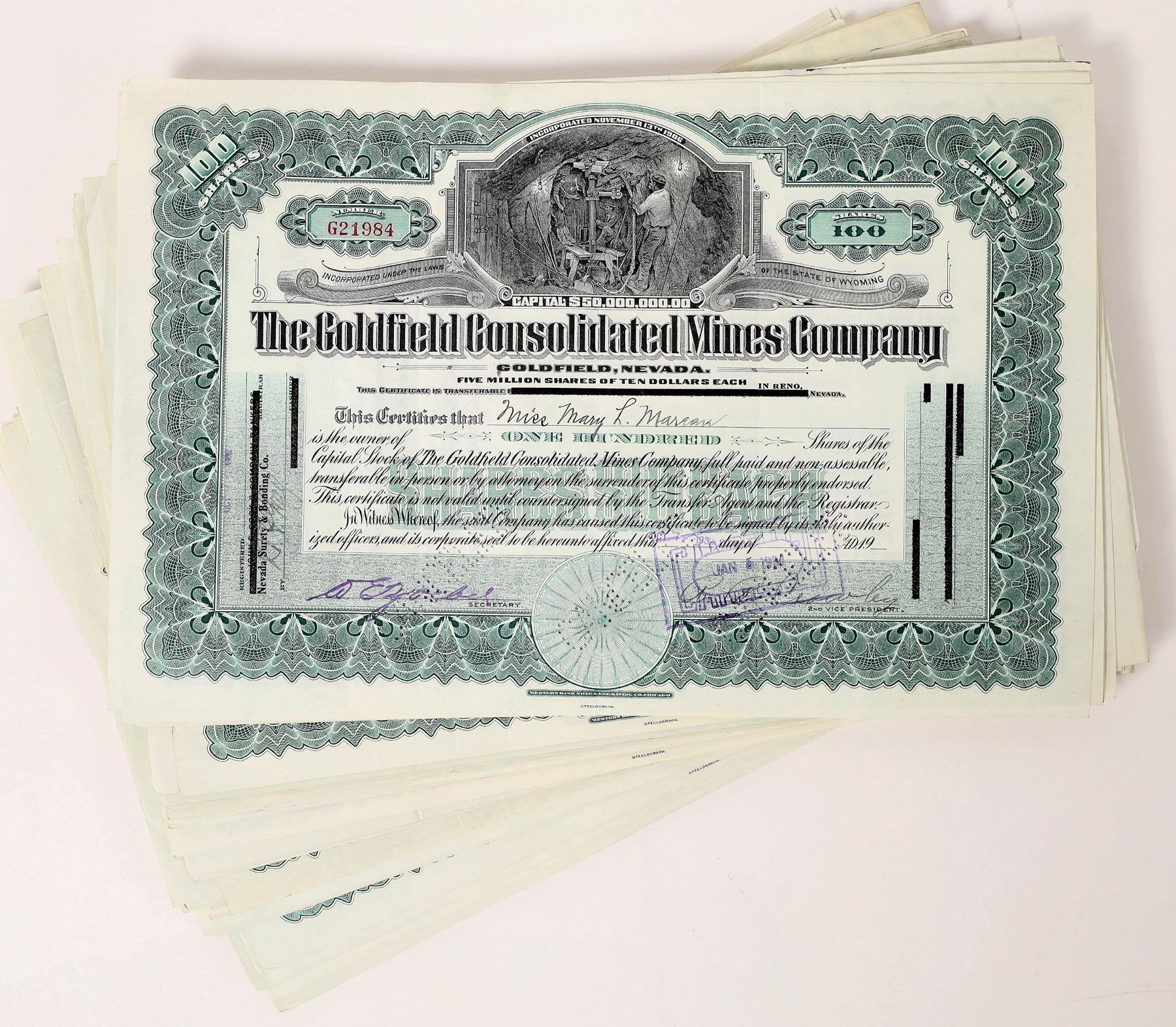 Lot of 100 issued stocks. Issued 1910-1933. Formed by Wingfield & Nixon. No Wingfield autographs. Green border, black print, and mine drilling vignette. Punch and stamp cancelled.