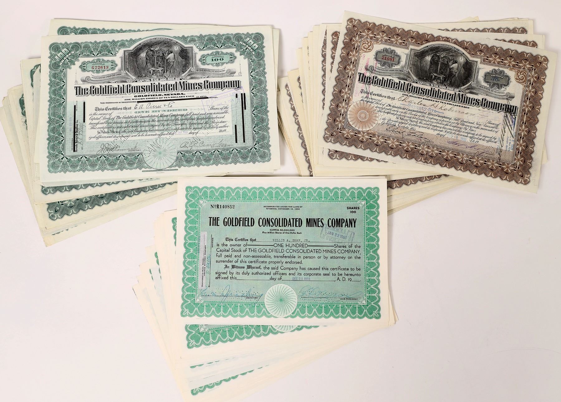 Lot of 125 issued stocks, three varieties. Formed by Wingfield and Nixon. No Wingfield autographs. 1) Brown border variety. 50 stocks issued 1908-1911. Mine drilling vignette. Punch cancelled. 2) Green variety. 50 stocks issued 1908-1933. Same drilling vignette. Punch cancelled. 3) Later version without vignette. 25 pieces issued 1958-60. Punch cancelled.