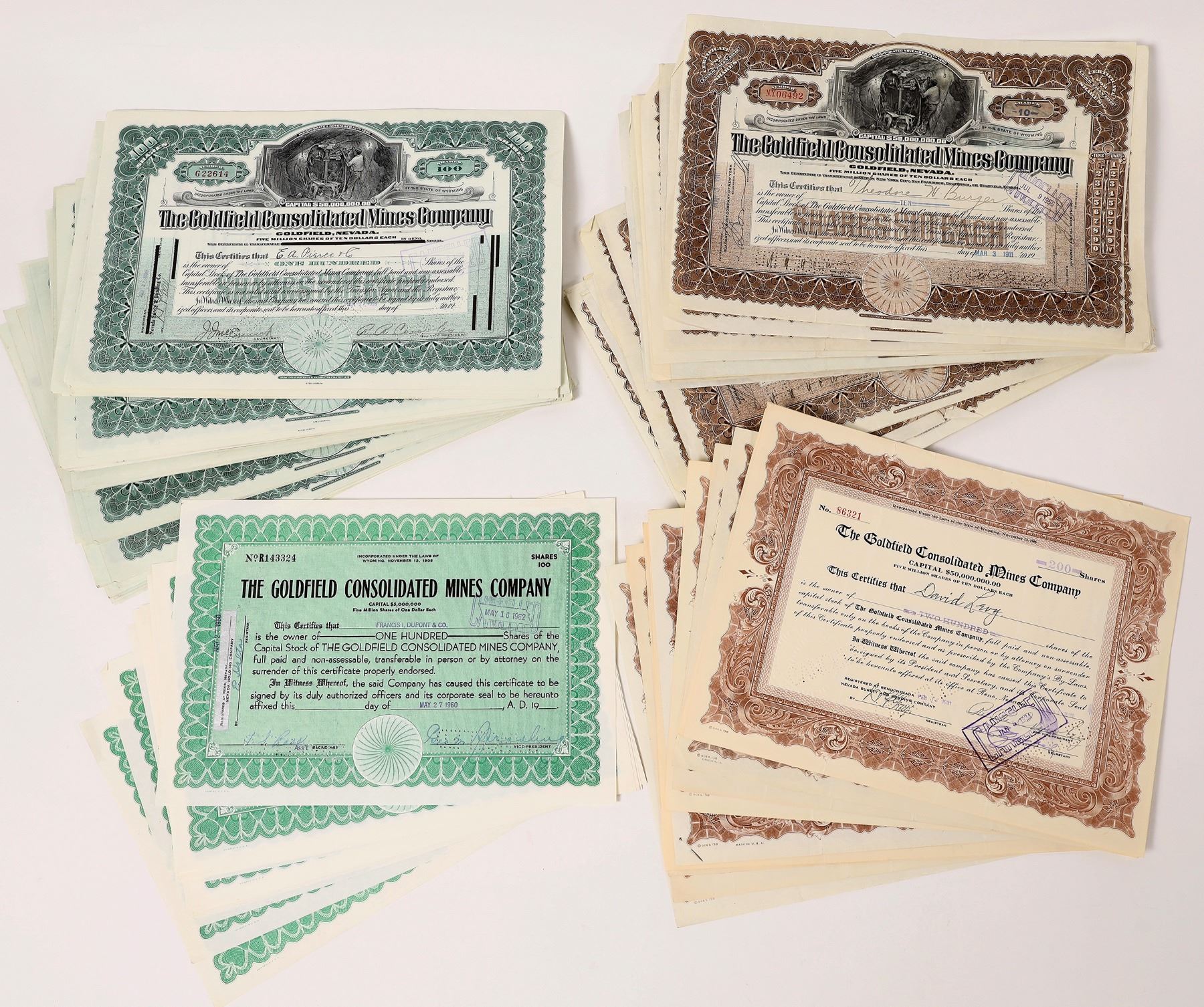 Lot of 125 issued stocks, 4 varieties. Formed by Wingfield and Nixon. No Wingfield autographs. 1) Brown border variety. 50 stocks issued 1908-1915. Mine drilling vignette. Punch cancelled. 2) Green variety. 50 stocks issued 1911-1938. Same drilling vignette. Punch cancelled. 3) Different brown border version without vignette. 10 pieces, 1920-1933. 4) Later version without vignette. 15 pieces, 1960. Punch cancelled.
