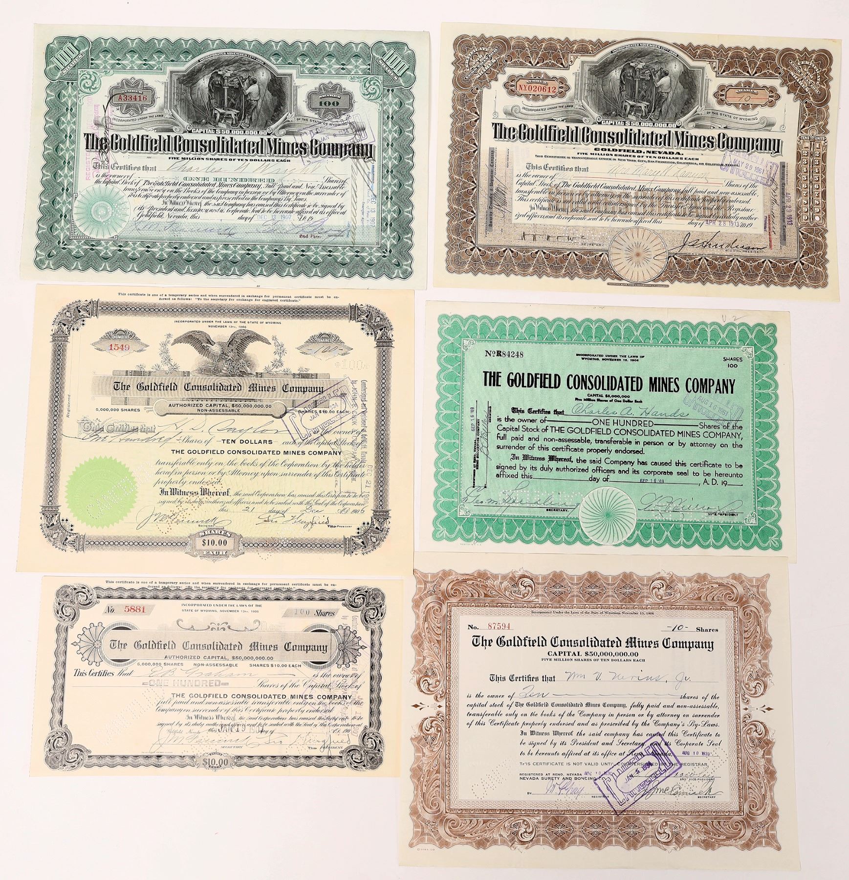Lot of 6 different including early pieces and 3 Wingfield autographs. George Wingfield was one of the Nevada's most powerful economic and political figures during the period from 1909 to 1932. He went from being a faro dealer to the position of richest man in Nevada in less than five years. With his partner, George Nixon, he established the Goldfield Consolidating Mining Company, which ultimately produced more than $50 million worth of ore. In 1906, they formed the Nixon National Bank of Reno. In 1908, Wingfield moved to Reno, where he became active in politics, banking, ranching, and hotels. 1-3) Wingfield autographs are on 1906, 1907, and 1949 stocks. All punch cancelled. 4-6) Two with similar design (drilling vignette), 1907 and 1913. Last is from 1939. Please inspect.