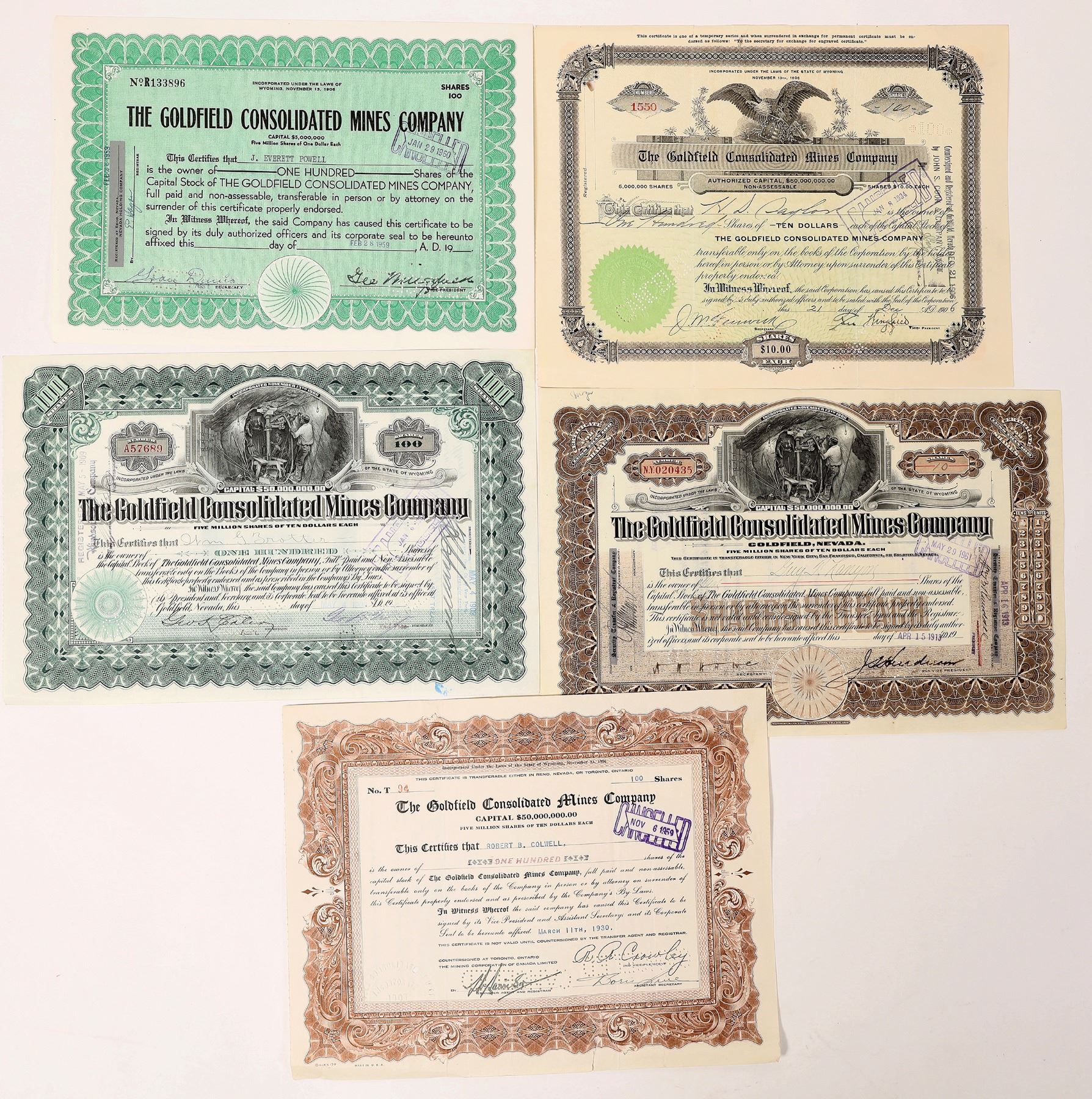 Lot of 6 different including early pieces and 3 Wingfield autographs. George Wingfield was one of the Nevada's most powerful economic and political figures during the period from 1909 to 1932. He went from being a faro dealer to the position of richest man in Nevada in less than five years. With his partner, George Nixon, he established the Goldfield Consolidating Mining Company, which ultimately produced more than $50 million worth of ore. In 1906, they formed the Nixon National Bank of Reno. In 1908, Wingfield moved to Reno, where he became active in politics, banking, ranching, and hotels. 1-3) Wingfield autographs are on 1906, 1907, and 1959 stocks. All punch cancelled. 4-6) Two with similar design (drilling vignette), 1909 and 1913. Last is from 1930. Please inspect.
