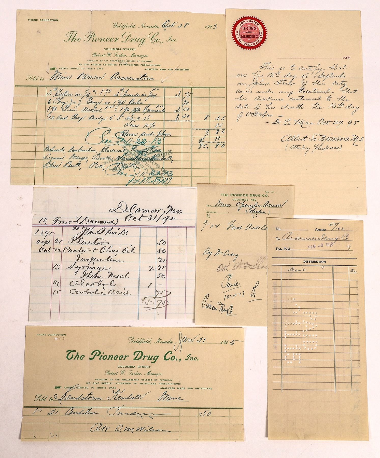 Lot of five. Goldfield: 1-2) two different Pioneer Drug billheads and 3) Sandstorm-Kendal Consolidated Mining Co. from Pioneer Drug. Delamar: 4) Circular logo billhead for John Shier Drugs and Medicines. Red on white. 5) Handwritten Delmar Drug October 31, 1895 receipt. (Happy Nevada Day.) [From the Fred Holabird collection. For thorough information on druggist and liquor dealers in Nevada, be sure you get Fred Holabird's books.]