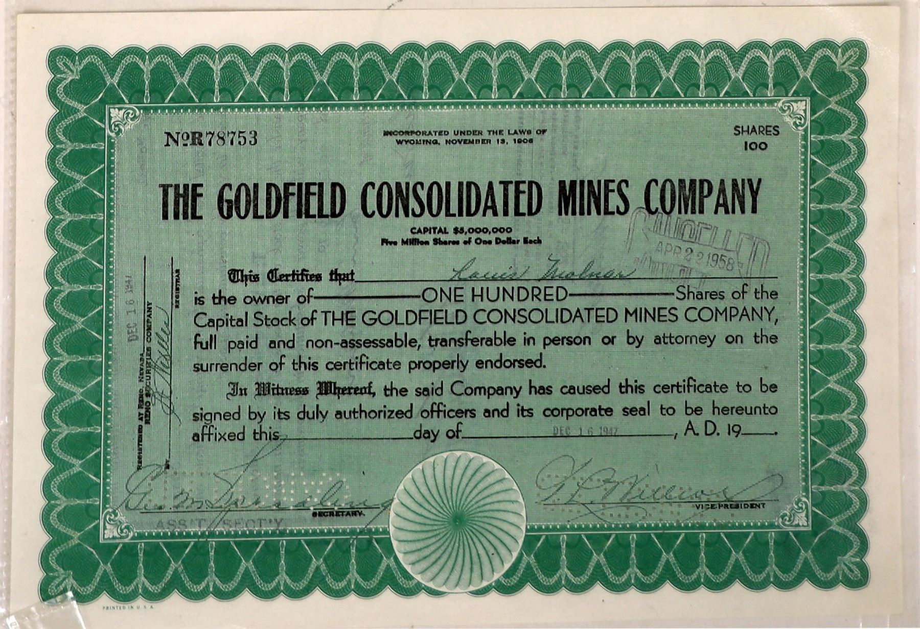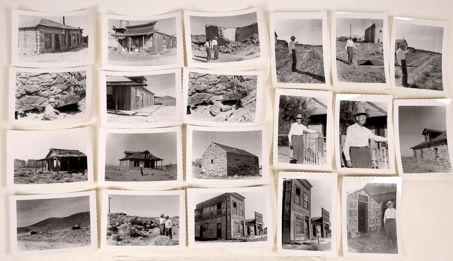 14x c. 1956 4.5x3.25" photos of Ghost Towns and prospecting in Goldfield and Diamondfield. Also, 1947 Goldfield Cons. Mines stock