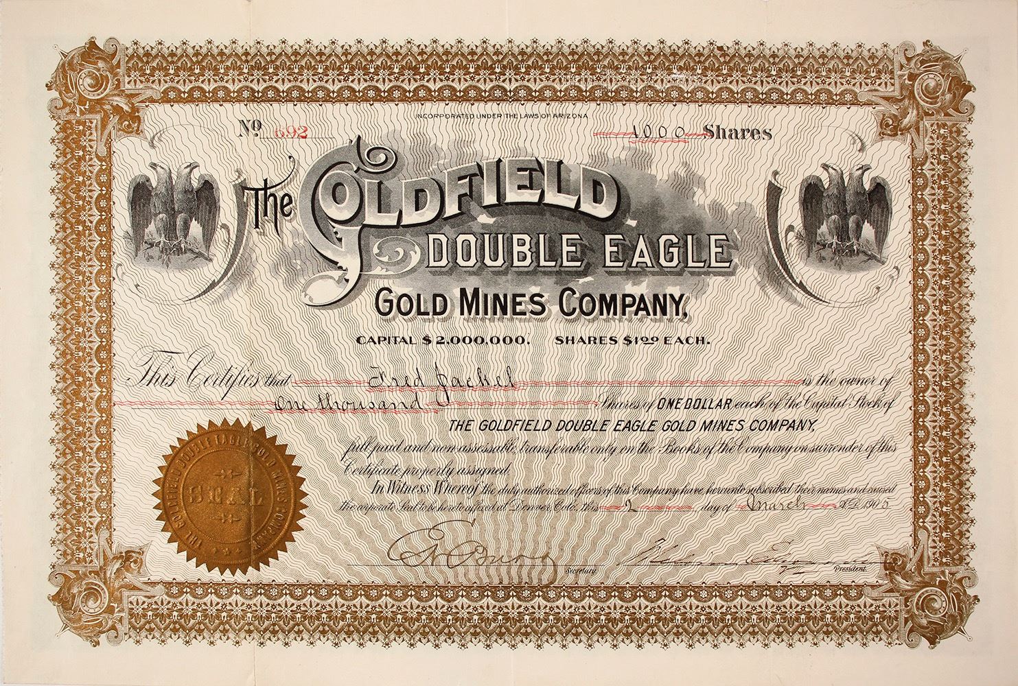 Number 692 for 1000 shares to Fred Jackel. Signed by president and secretary. Vignette is a pair of double eagles. Interesting numismatic reference to the gold double eagle $20 dollar piece. Oversized. Uncancelled. Tears where the two folds meet the upper edge. Nice striking piece. The first volume of the "Mines Directory" of 1910 tell us the this mine was incorporated in 1904 in Arizona. To this point it has been developed by tunnel and surface work. No indication of any ore of value! (Bennett Collection) Date: 1905 Location: Goldfield, Nevada HWAC# 59871