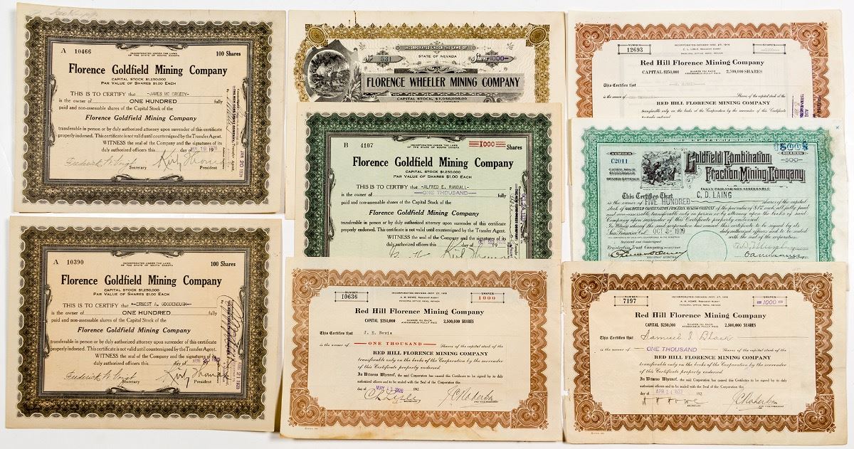 Eight stocks total. Three are Red Hill Florence Mining Company (1923, 1926 and 1938). All issued and uncancelled. Folds and pinholes. Three others are Florence Goldfield Mining Company (1925, 1926, and 1928); all issued, signed by corporate officers, and uncancelled. Also a Goldfield Combination Fraction Mining Company (1909) with vignette; issued, not cancelled. Folds and pinholes. Last is Florence Wheeler Mining Company (1908) with miner vignette; issued, uncancelled, with deep folds and pinholes. (Prag Collection) City: Goldfield State: Nevada Date: 1908-1938 ID# 28643