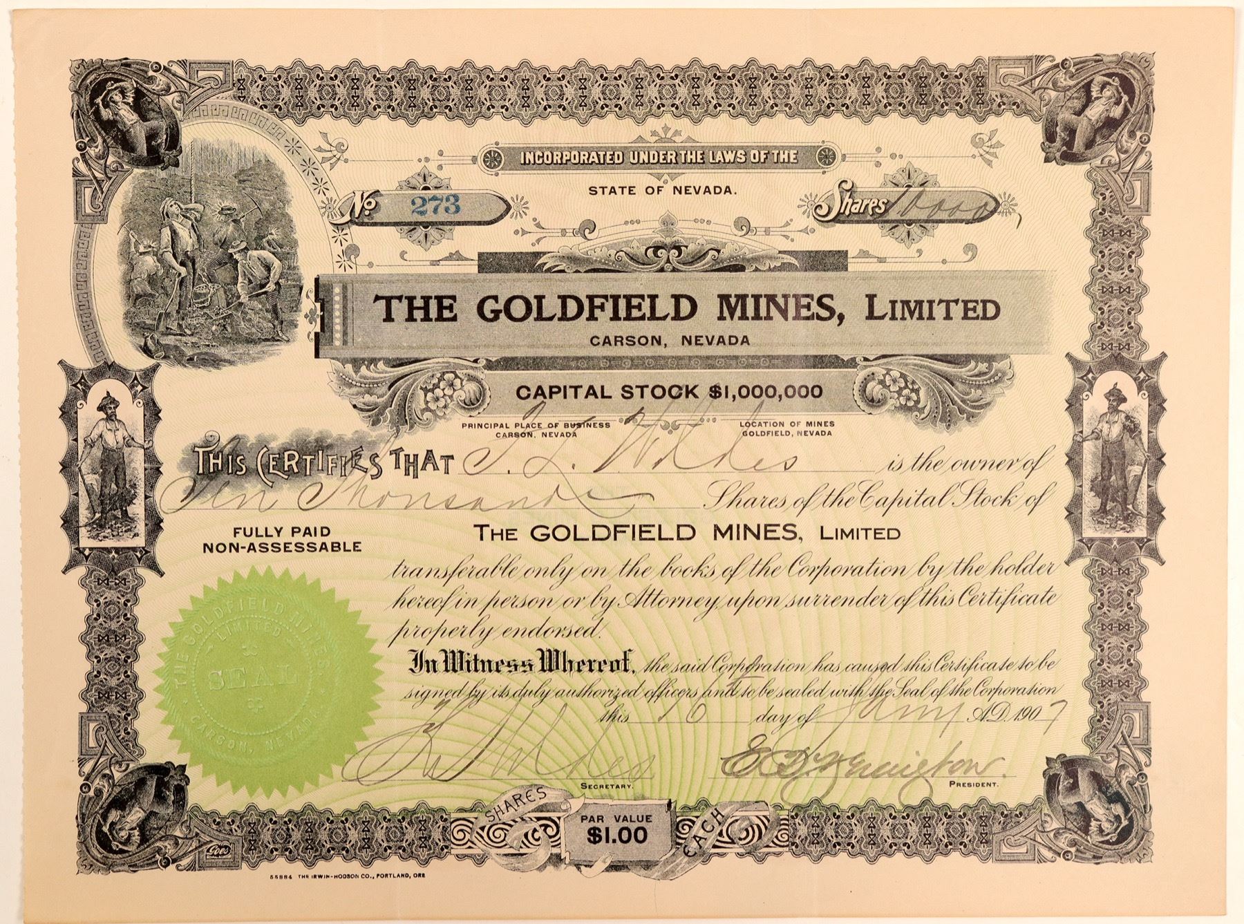 Goldfield Mines, Ltd. Stock Certificate Signed by EB Yerington  (102544)