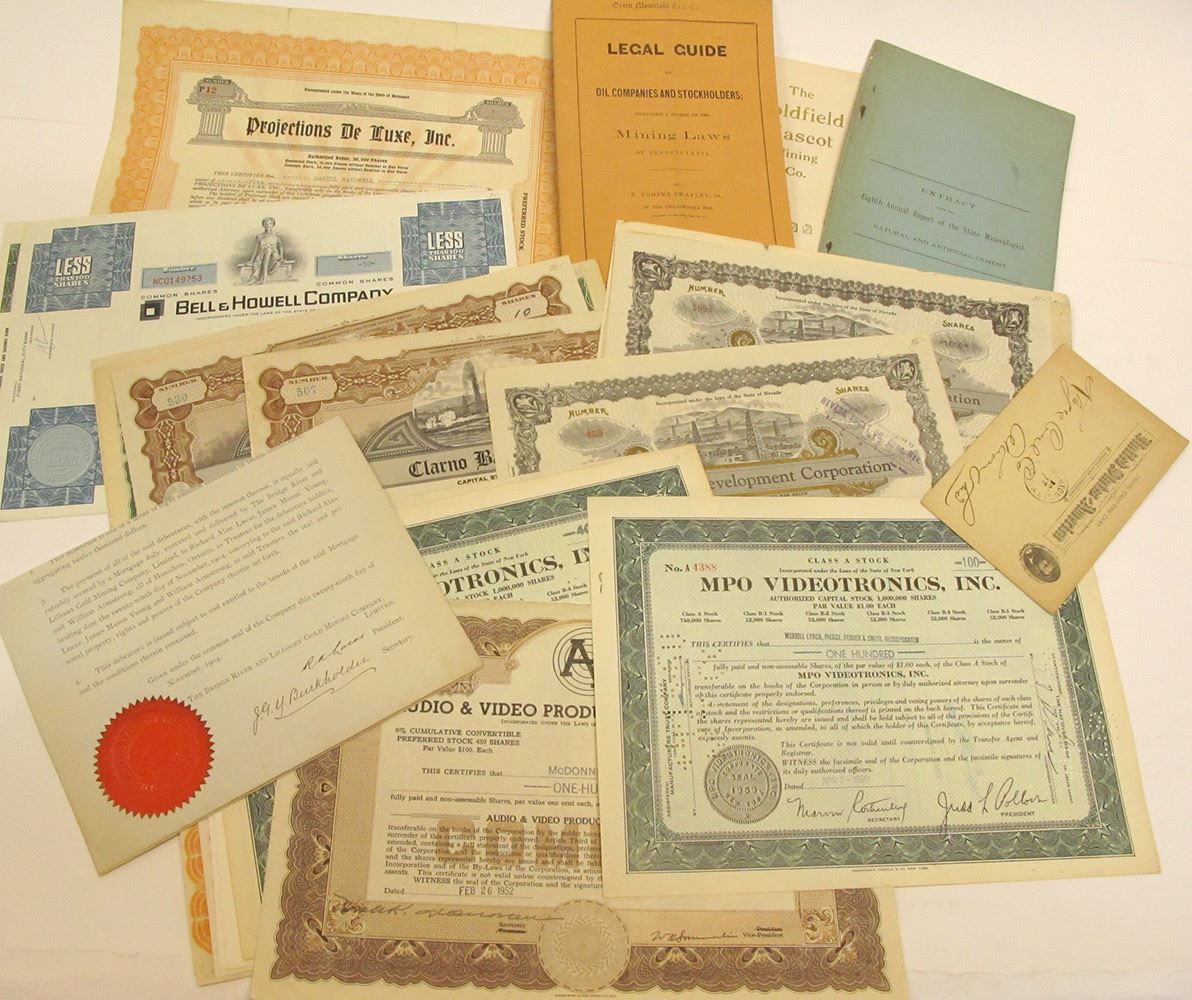 This lot contains a selection of 23 stock certificates from various video corporations and a packet of ephemera from Goldfield Nevada, including a brochure from The Goldfield Mascot Mining Company. from around 1906. All are in very nice condition. Date: Location: Goldfield, Nevada HWAC# 571620