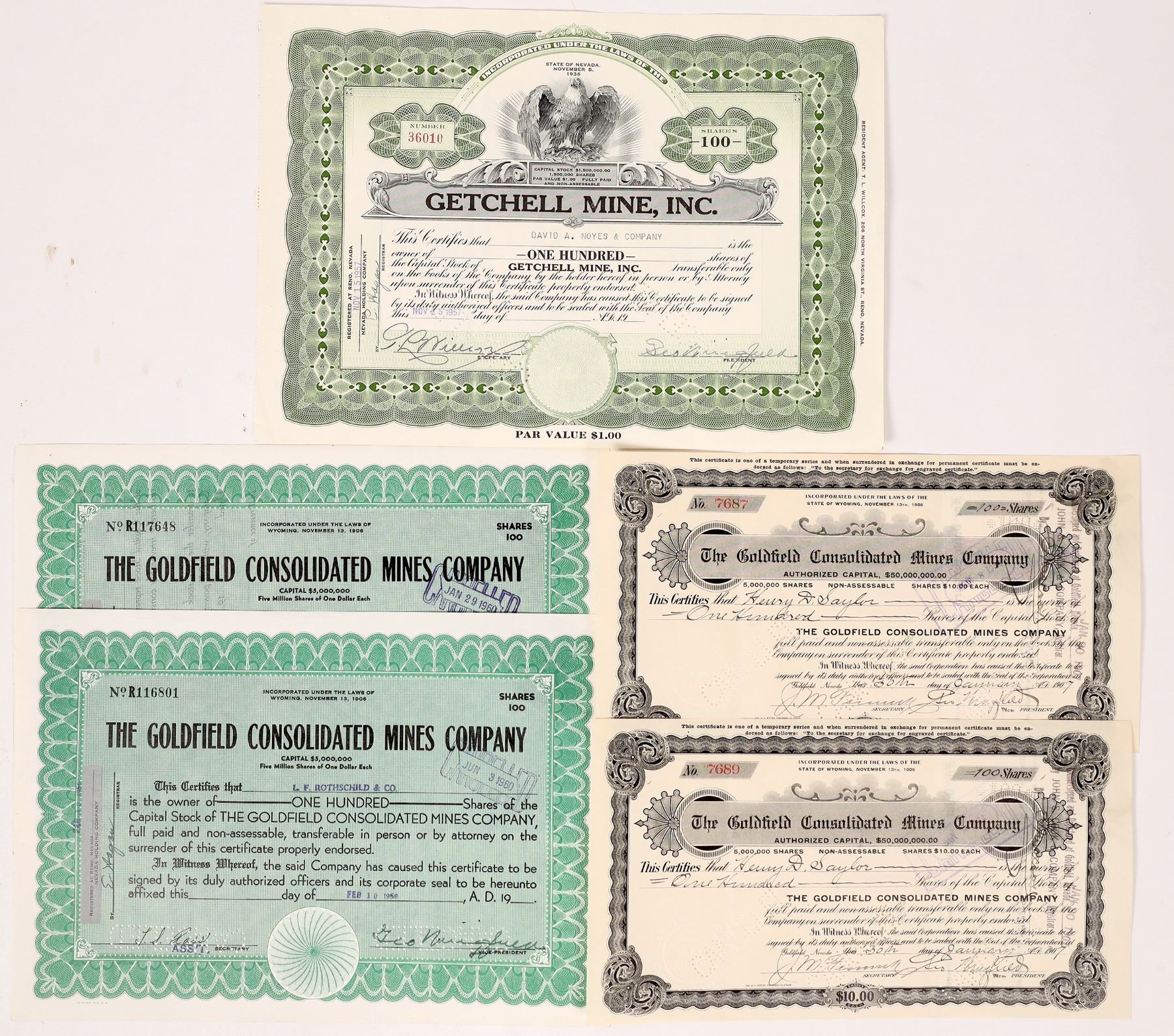 Lot of 5 stocks, 3 varieties, all signed by George Wingfield, a prominent Nevada banking, mining, and political figure. He went from being a faro dealer to the position of richest man in Nevada in less than five years. With his partner, George Nixon, he established the Goldfield Consolidating Mining Company, which ultimately produced more than $50 million worth of ore. In 1906, they formed the Nixon National Bank of Reno. In 1908, Wingfield moved to Reno, where he became active in politics, banking, ranching, and hotels. 1) Goldfield Consolidated Mines Company. Two early stocks issued in 1907, signed by Wingfield as vice president. Punch cancelled. 2) Two later stocks from the same company, also signed by Wingfield as VP in 1956. Punch and stamp cancelled. 3) Getchell Mine, Inc. Stock issued in 1957, signed by Wingfield as president. Punch cancelled.