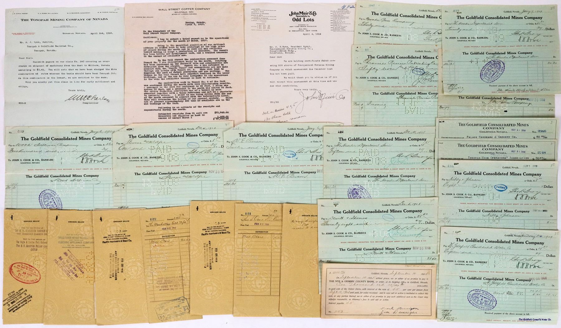 Lot of 24. Most is for the Goldfield Consolidated Mines Company. Includes: 1904 Nye & Ormsby County Bank promissory note; a letter from John Muir & Co., 1918, to Reorganized Kewanus Mining Co.; a 1910 letter from the Tonopah Mining Co. of Nevada to the auditor of the Tonopah & Goldfield Railroad; a 1917 letter from the Wall Street Copper Company (Goldfield & Luning); 13 checks from the Goldfield Cons. MC, 1908-1916; and 7 vouchers attached to Goldfield Cons. Milling & Transportation Co. checks, 1916.