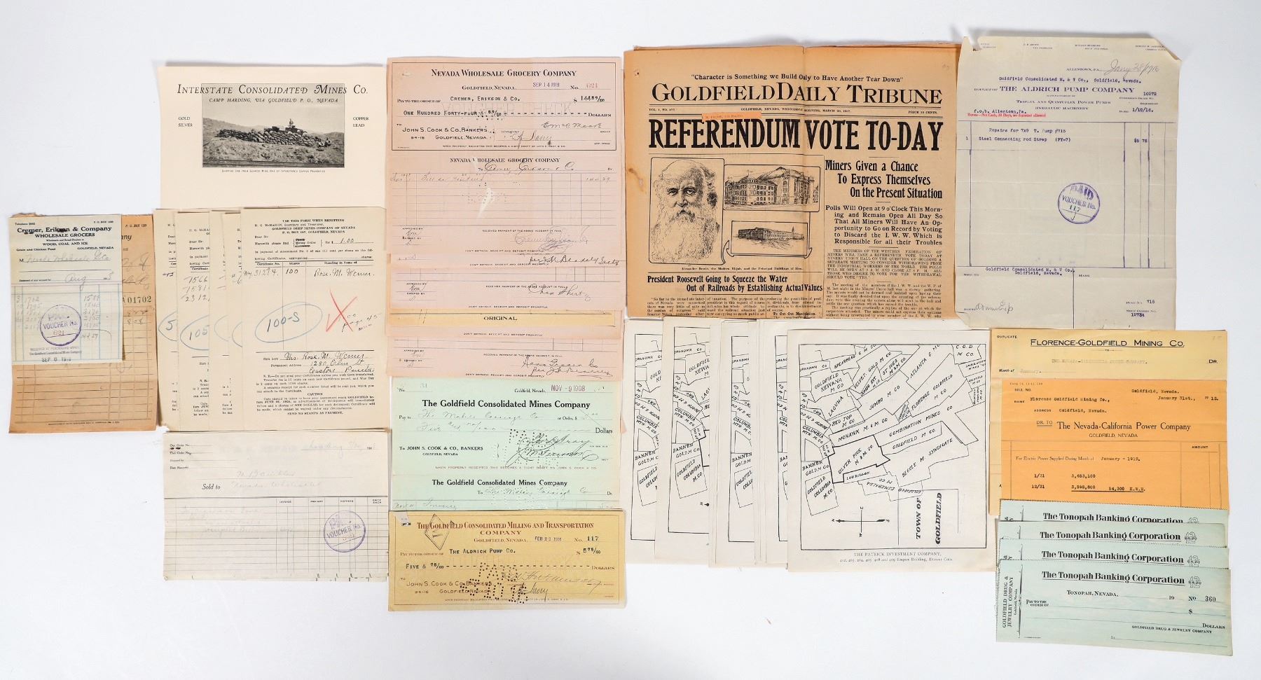 Lot of 30+ items. March 20, 1907 newspaper, Goldfield Daily Tribune, with article about Teddy Roosevelt; 12 maps of claims from the Patrick Investment Co.; unused checks from the Goldfield Drug and Jewelry Co.; Goldfield Deep Mines Co of Nevada prospectus; assorted receipts with checks attached; Goldfield Deep Mines ephemera; and two choice unused pictorial letterheads for mine at Camp Harding (near Goldfield).
