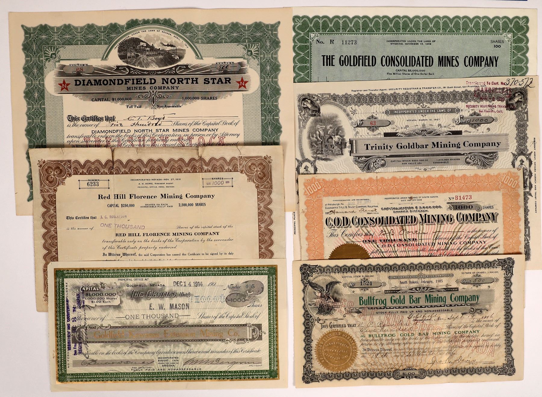 Lot of 7 different. Some rare pieces here. Included: Goldfield Kewanas Extension Mining Company (1914); Red Hill Florence Mining Company (1922); Diamondfield North Star Mines Company (1913); COD Consolidated Mining Company (1912); Bullfrog Gold Bar Mining Company (1906); Trinity Goldbar Mining Company (1927); and Goldfield Consolidated Mines Co. (1934, signed by George Wingfield). Please inspect.