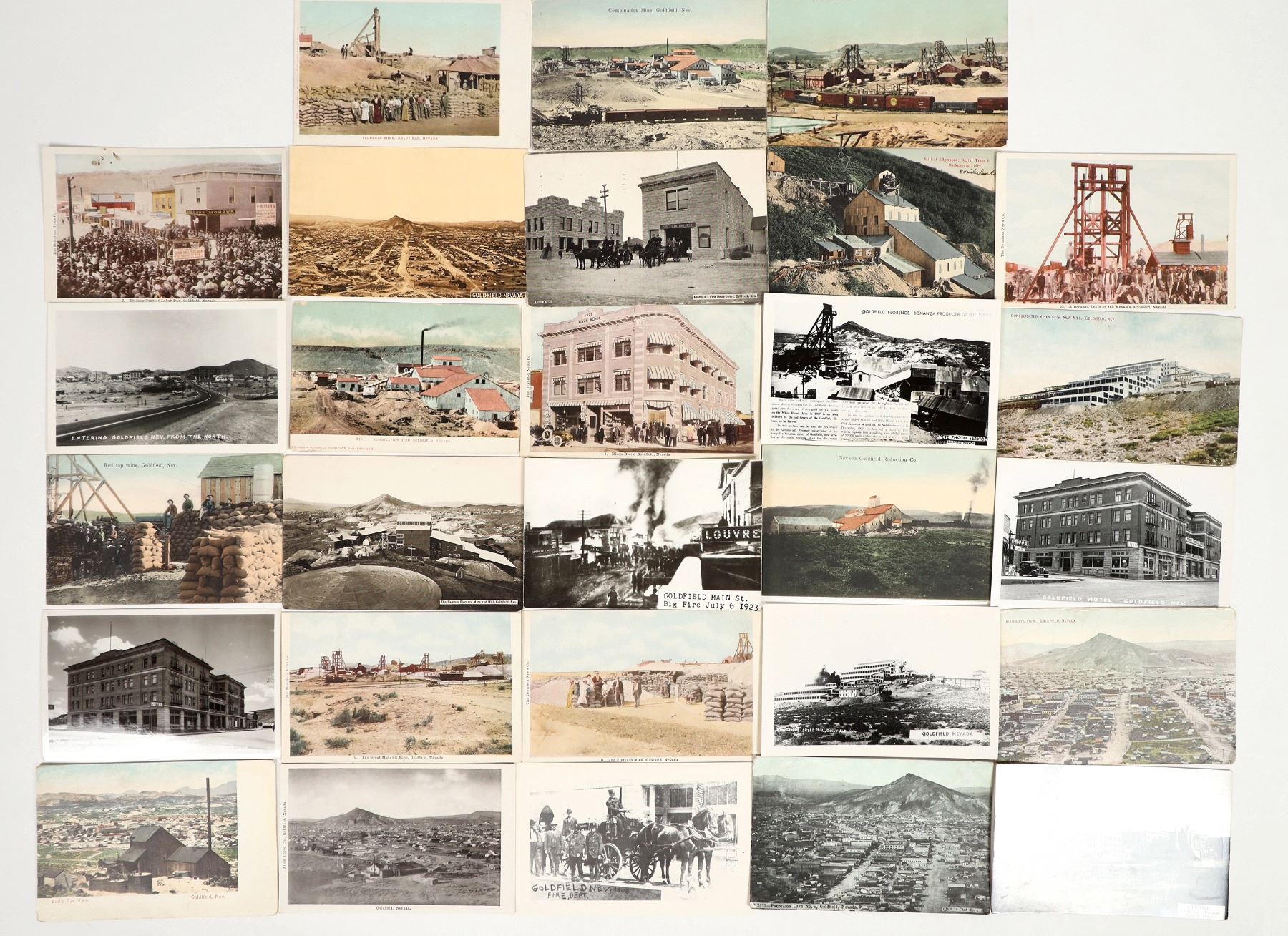Lot of 28. Includes 8 real photo postcards and the rest are early printed cards (incl. amber). Views include: Goldfield Hotel, Consolidated Mill, Goldfield Florence Mine, Fire Dept., several birds-eye views, drilling contest, Mohawk Mine, Rep Top Mine, Combination Mine, etc. Please inspect.