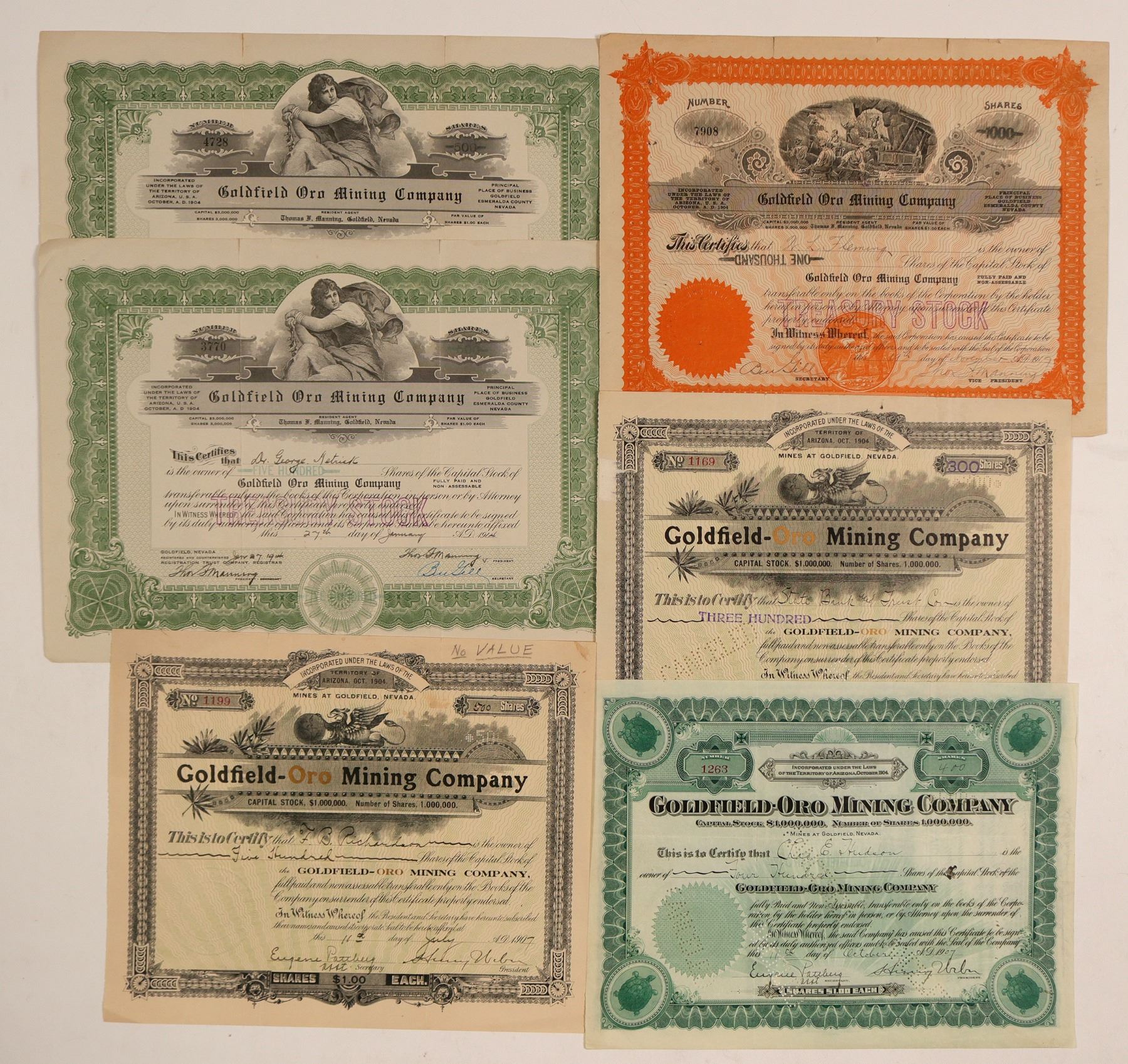 Lot of 6. Four different varieties. 1) Two issued in 1907, one cancelled, with gold highlight in title, griffin vignette. Inc. in AZ Territory, 1904. Pinholes, folds. 2) Different version issued in 1907, punch cancelled, green border with turtle vignettes. Folds, pinholes. 3) Two stocks issued in 1914 and 1915, green border with allegorical vignette. Pinholes, folds with some separation, bends. 4) Version issued in 1917 with orange border and mining vignette. Heavy folds with some separation, toning. According to the Mines Register, 1918, the Goldfield-Oro Mining Company had 33 acres developed to 800 feet depth. $40 assays reported in 1916. Also developing the Vulture Mine in the Wonder District. Ken Prag Collection
