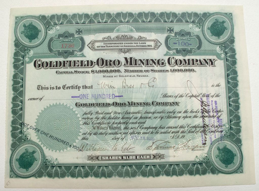 #1736 for 100 shares to Wein Bros. & Co. in 1909. Signed by William Eib(?) and Thomas (?). Cancelled. Four turtles adorn the corners. Green on white. (Ames Collection) Date 1909 Goldfield, NV hwac 3849