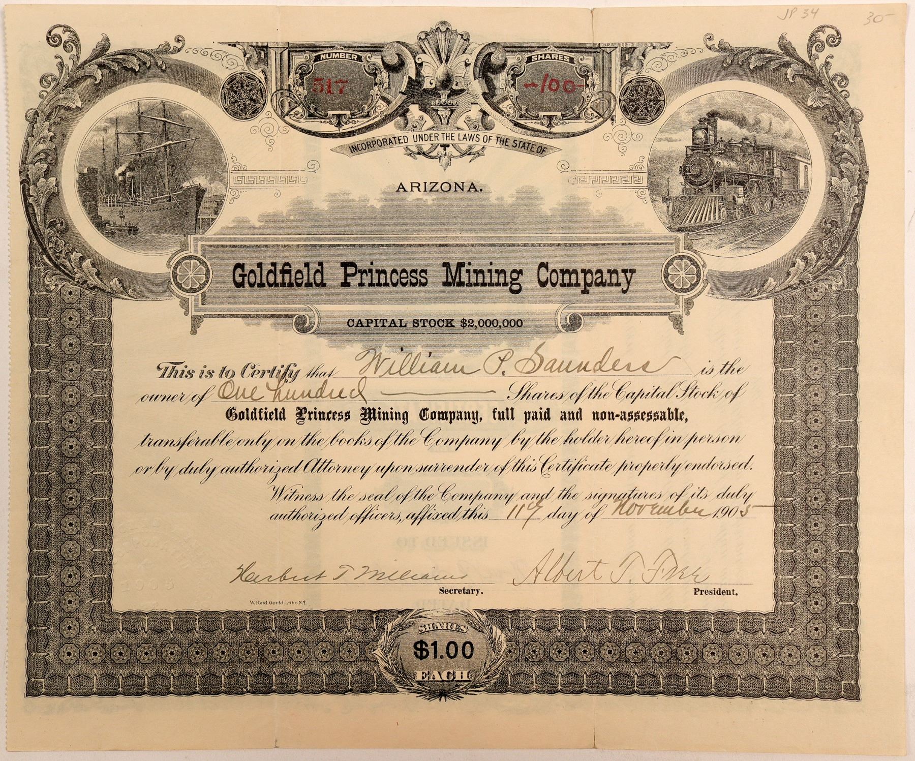 We have not seen this before! Inc.in Arizona. No. 517, issued for 100 shares to William P. Saunders on Nov. 11th, 1905. Signed by president Albert T. Free and secretary Herbert T. Williams. Not cancelled. Black border and print. Two non-mining vignettes: ship (left) and locomotive (right). Printed by W. Reid Gould, NY. Folds with separation starting. 9 x 11" According to The Mines Directory, Vol. 1, the company's 9 claims were located in the Gold Mountain and Lida Districts, Esmeralda County. Ken Prag Collection