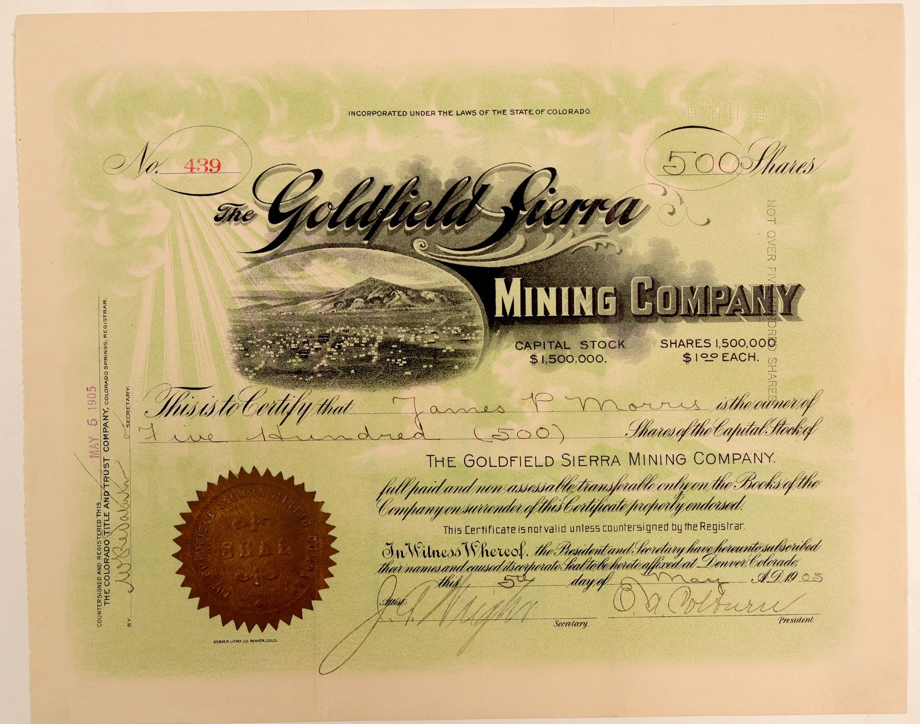 Inc. in Colorado. No. 439, issued for 500 shares to James P. Morris on May 5th, 1905. Signed by president E.A. Colburn and secretary J.A. Wright. Not cancelled. Attractive design with green background, black print, gold seal, and great vignette of early Goldfield (as a tent camp). Printed by Denver Litho Co. Folds, light wear. 8.75 x 11" According to Goldfield Gossip, 1907, the company had 8 claims, 103 acres. Developed by 40 feet shafts. In 1919, the Yellow Tiger absorbed this company. Ken Prag Collection