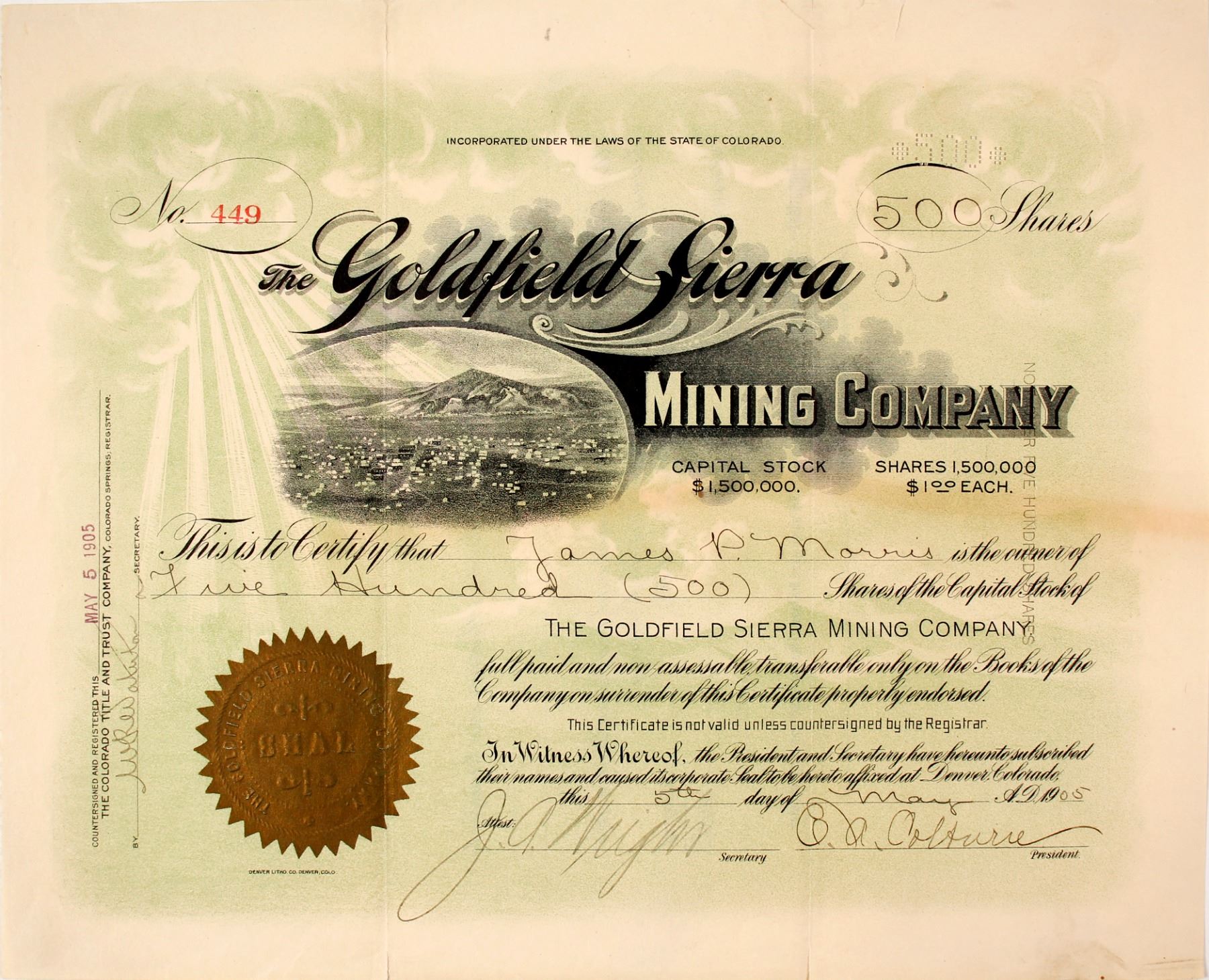 Fabulous vignette of Goldfield when it was still primarily a tent town! Number 449 for 500 shares to James Morris in 1905. Signed by secretary JA Wright and president CA Culture. Green on white! Small rip, small hole in middle of stock, discoloration in middle on right, etc. Overall nice. In 1919 the Yellow Tiger absorbed this company. (Bennett Collection) State: Nevada City: Goldfield Date: 1905 HWAC# 59868