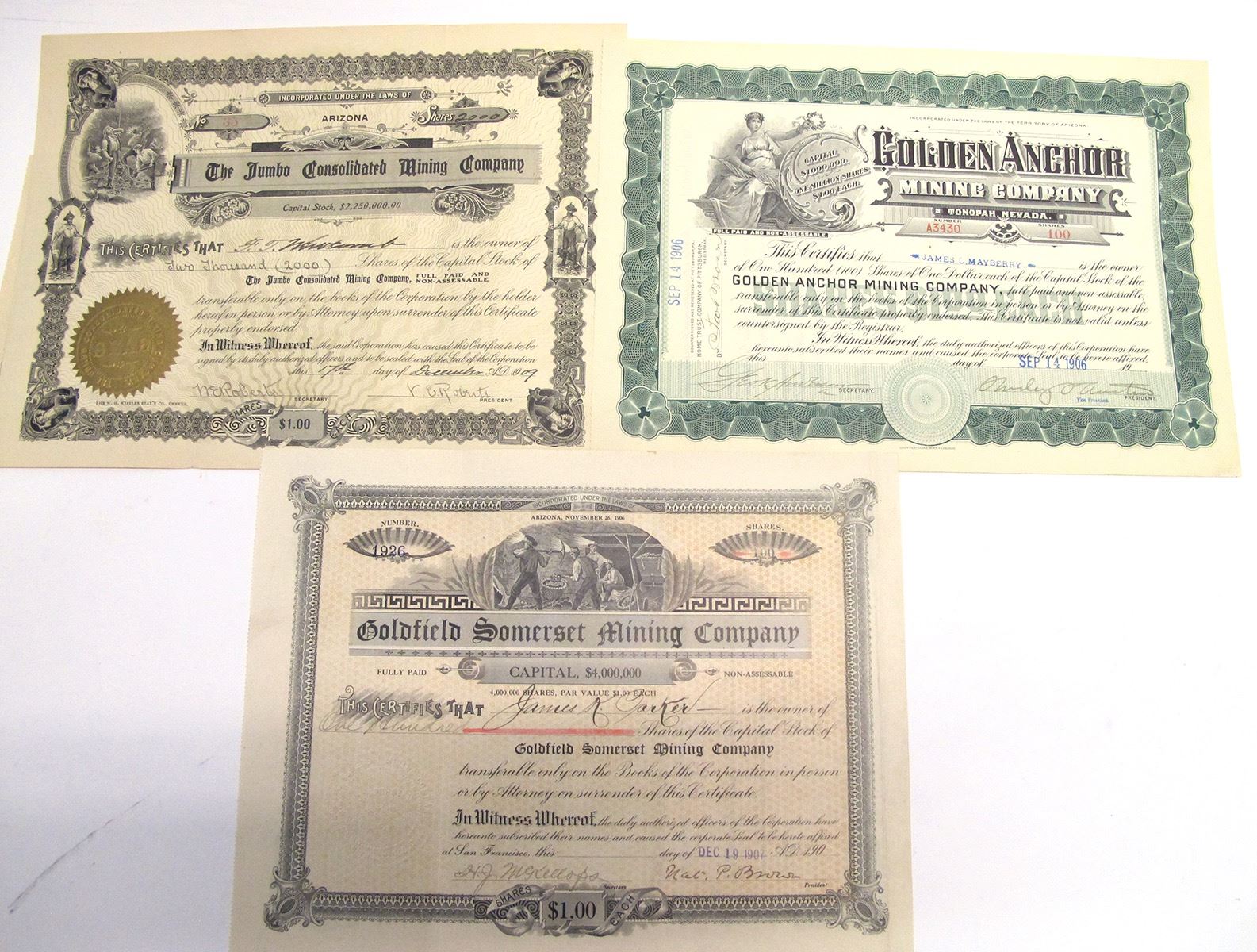 Lot of 4. Three Goldfield, one Tonopah. Included: Golden Anchor Mining Company (Tonopah, 1906, not cancelled, allegorical vignette); MOhawk Extension MC (Goldfield, 1907, not cancelled); Jumbo Consolidated Mining Company (Goldfield, 1909, not cancelled, mining vignettes); and Goldfield Somerset MC (1907, not cancelled, mining vignette). Usual folds. Date: 1906-1909 Location: Goldfield, Nevada HWAC# 66010