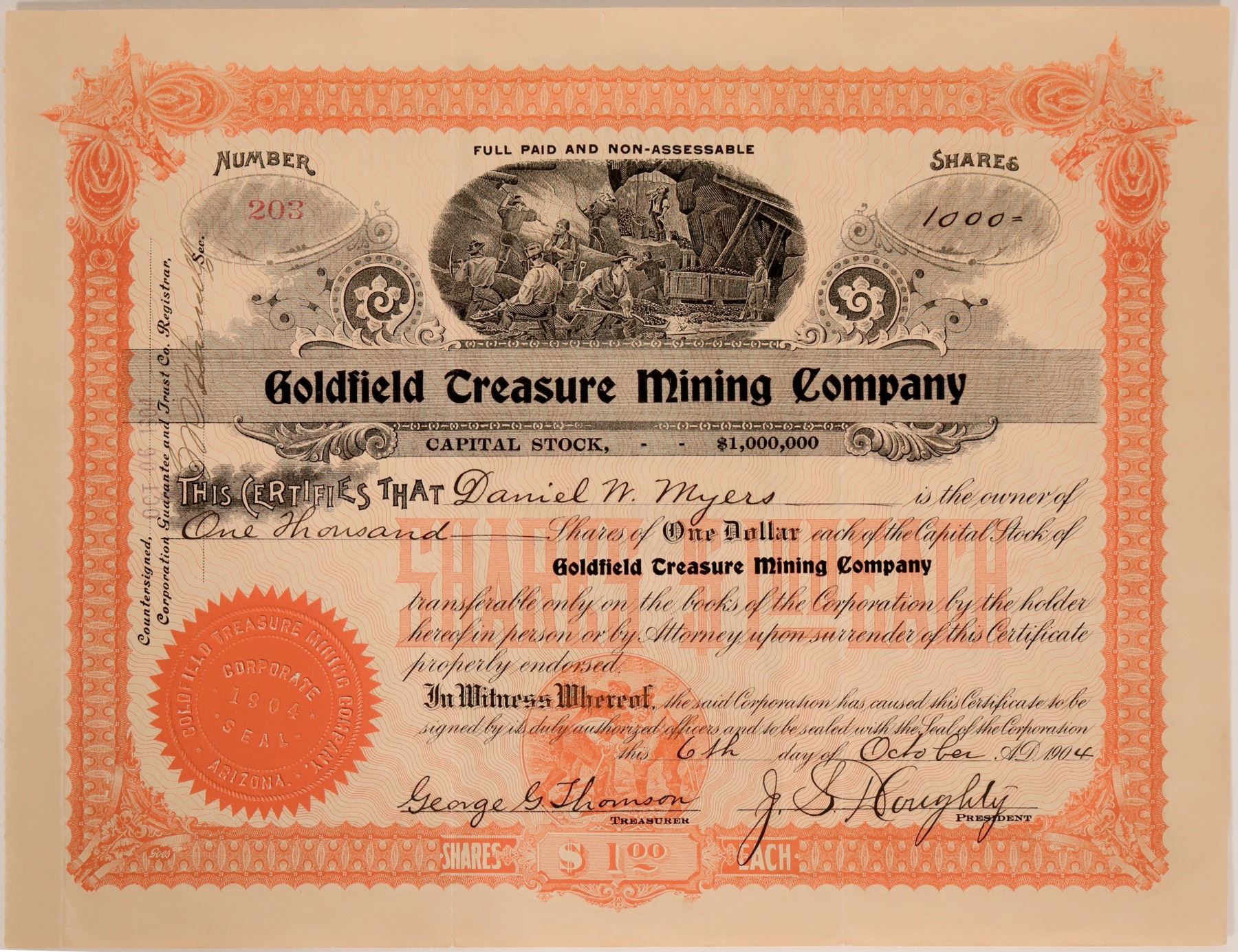 Cert. #203, issued for 1000 shares to Daniel W. Myers. Signed by J.S. Doughty as president and George G. Thomson, treasurer. The company held five claims adjoining the Adams, in the Goldfield district, three claims north of Vernal, at Diamondfield, and five claims on the north side of Banner mountain in the Goldfield district. Nice underground mining vignette. Small fold split and tiny tear tape repaired on the verso. Very attractive certificate. Uncancelled. State: Nevada City: Goldfield Date: 1904