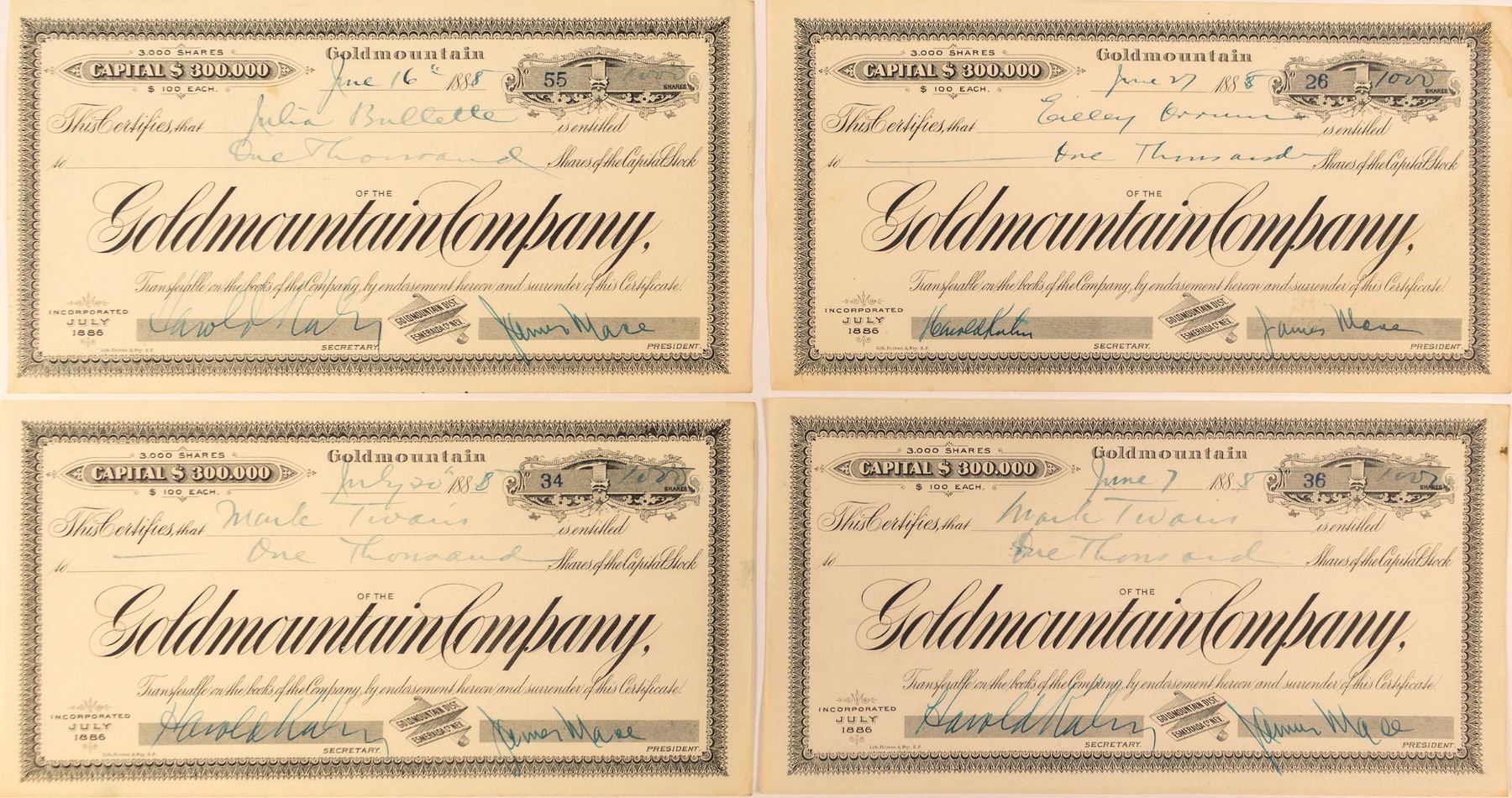 A fabulous suite of four certificates sold by Graham Hardy in Virginia City in the early 1960s to stimulate the new collecting field of stock certificates. He "issued" them to Julia Bullete, Eilley Orrum (Mrs. Sandy Bowers), and Mark Twain.