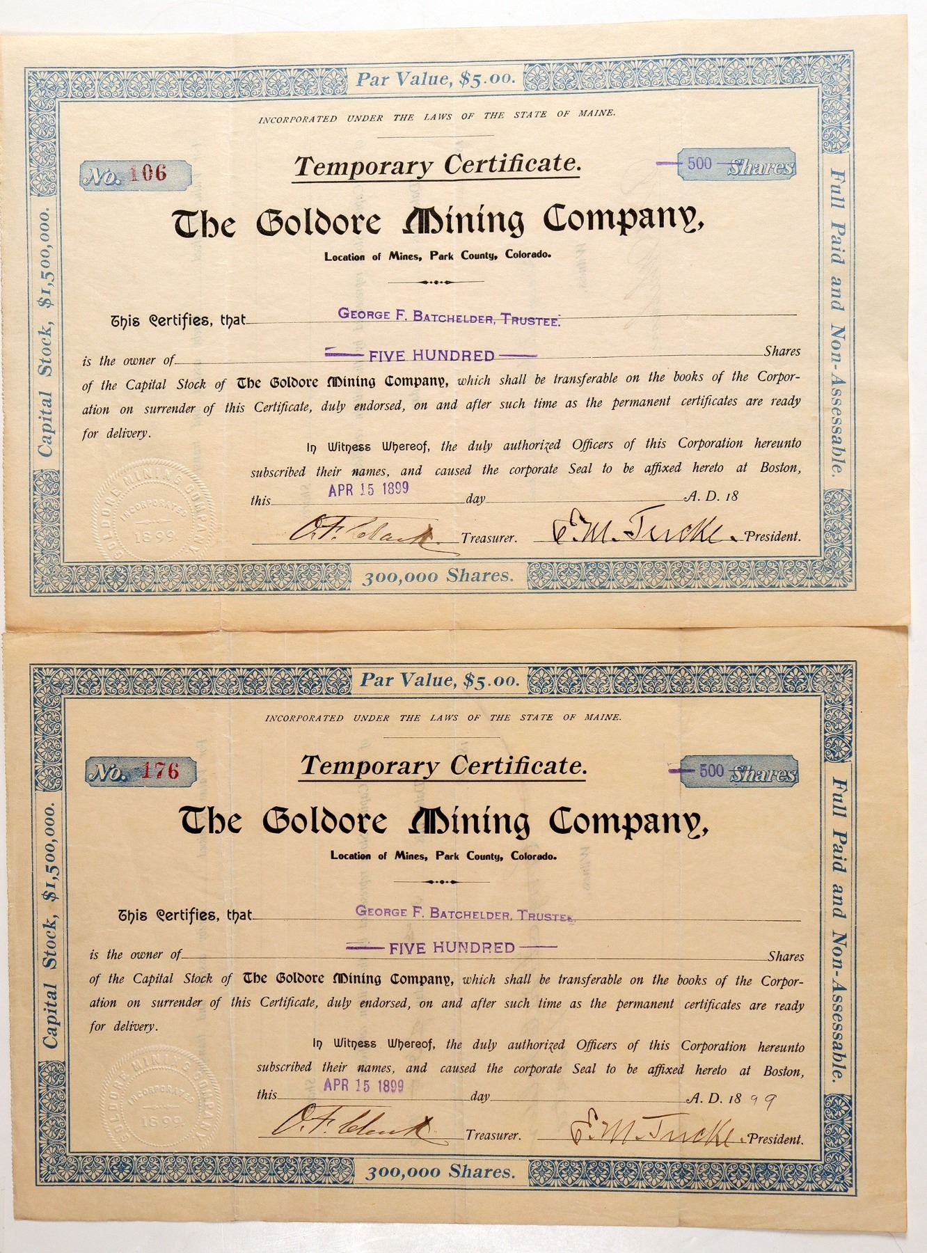 Lot of two. Location of Mines, Park County, Colorado (printed under title). Both are Temporary Certificates issued in 1899. Both to George F. Batchelder for 400 shares. Neither cancelled. Blue border. 7.5 x 11.5" Folds. A July 7th, 1899 Park County Bulletin article notes that"George O'Brien is running a big tunnel on the property of the Goldore mining company. He is taking good ore out of the upper workings. Two shifts are working regularly and a third will be put on in a few days." () State: Colorado City: Park County Date: 1899