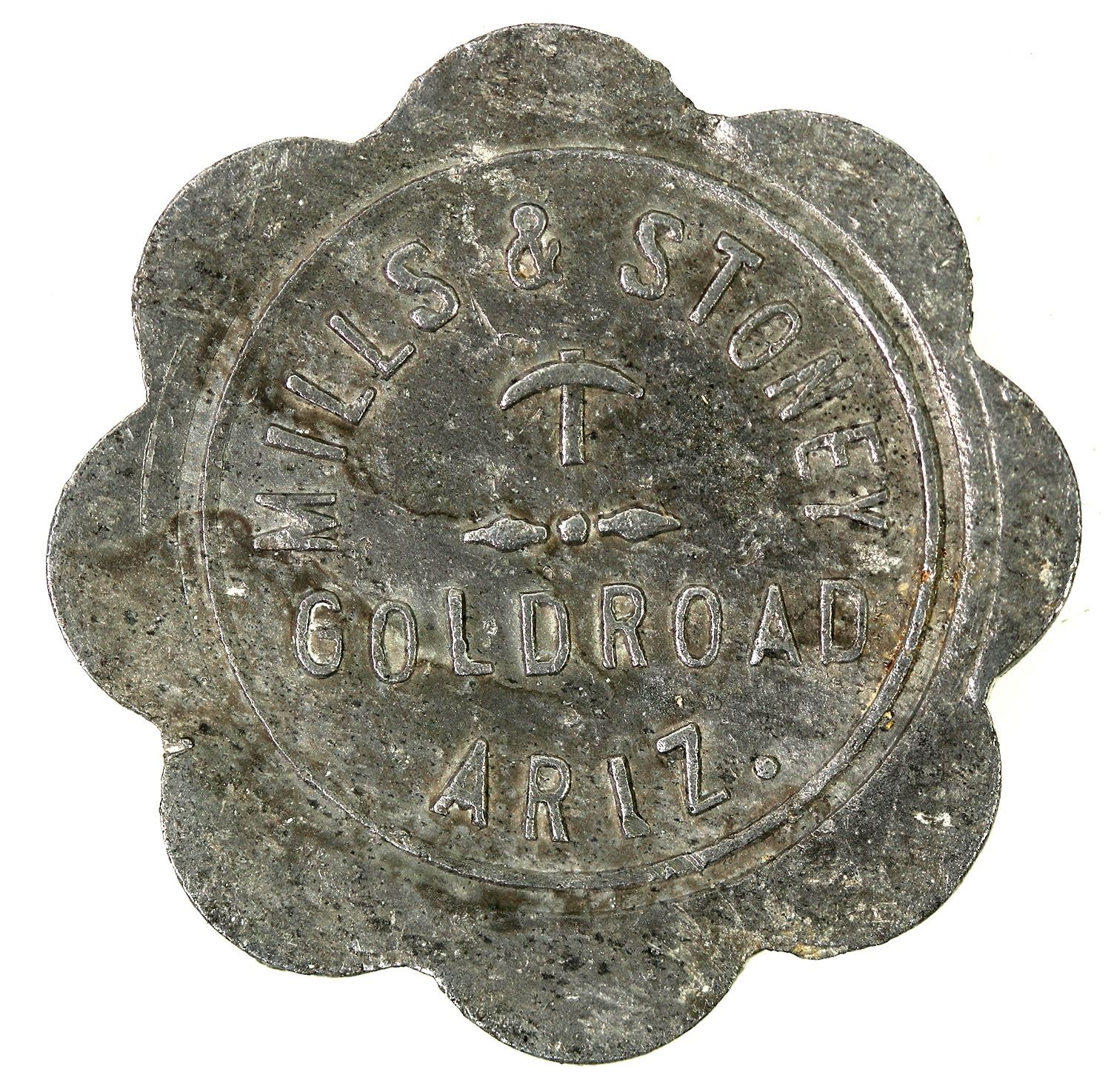 A trade token from Goldroad, Arizona depicting a miner's pick. This token has a floral-like shape, and the circular inner rim is off-center by about 1mm. Token is highly legible and is in good condition with minor wear. The circular rim is worn down significantly on the back, and the coin is slightly warped, with the petal-like protrusions cupping very slightly towards the front in a manner resembling a flower in bloom. See photo.