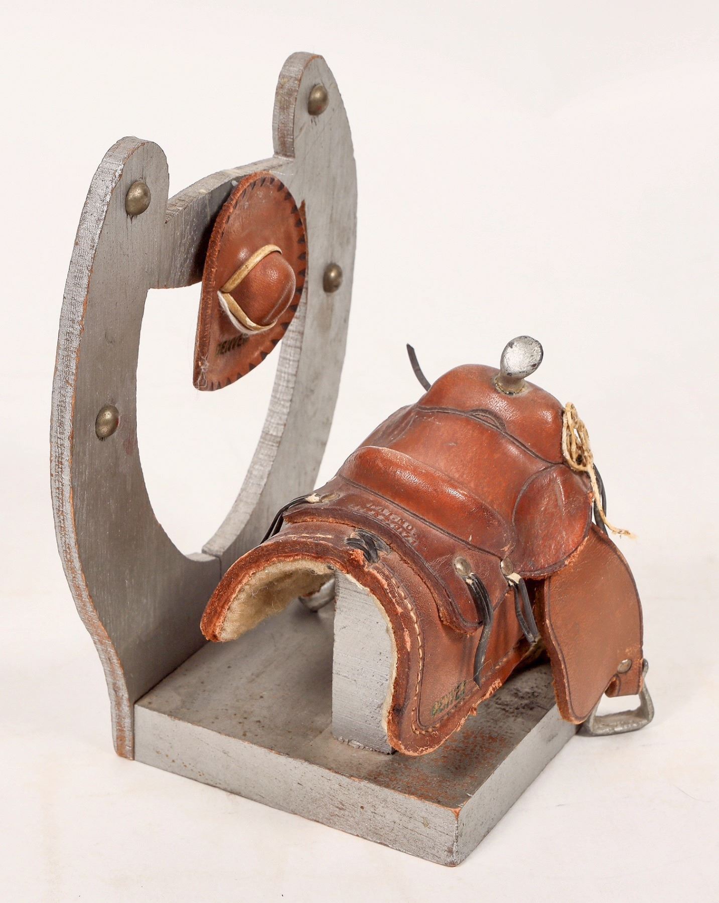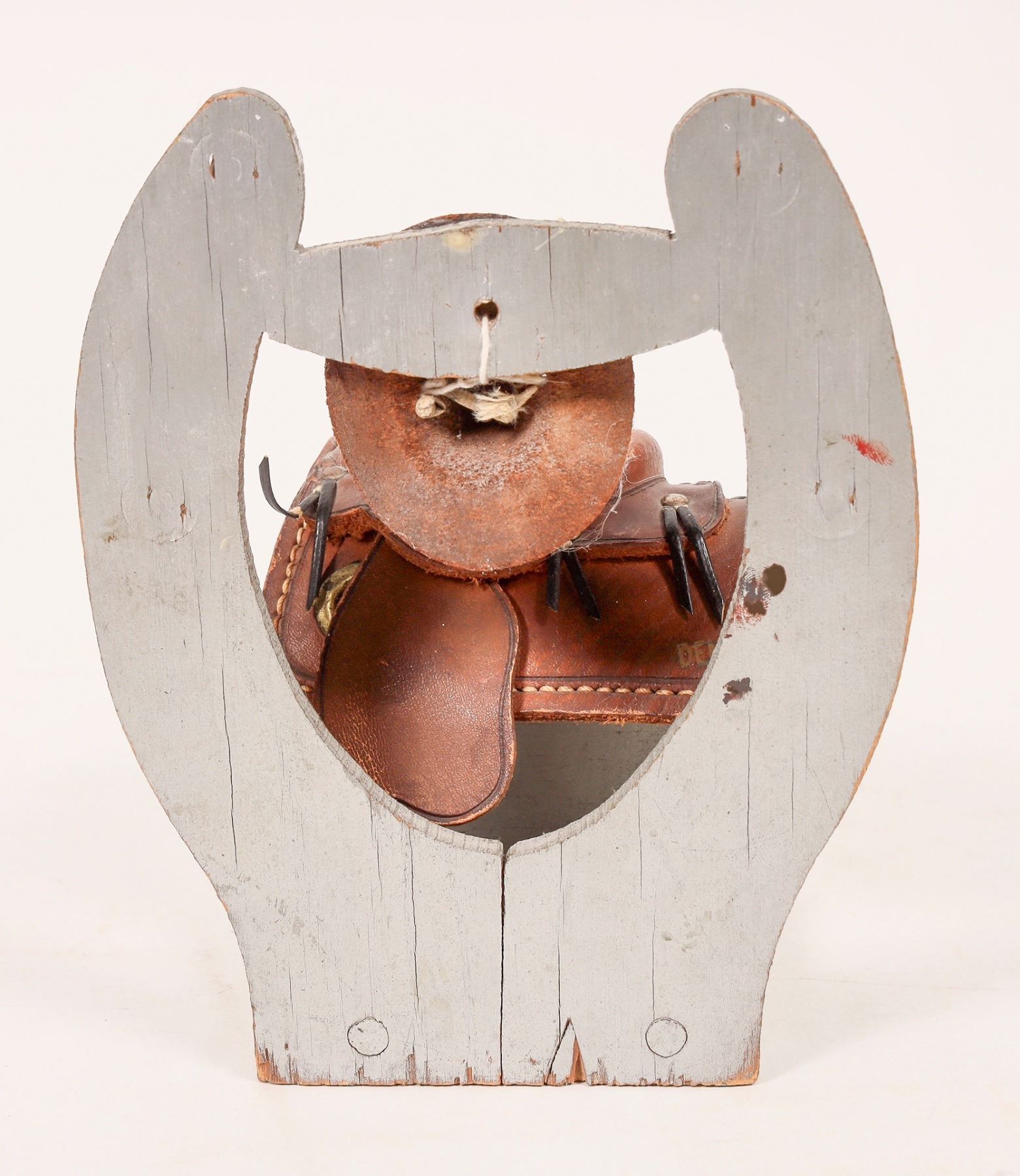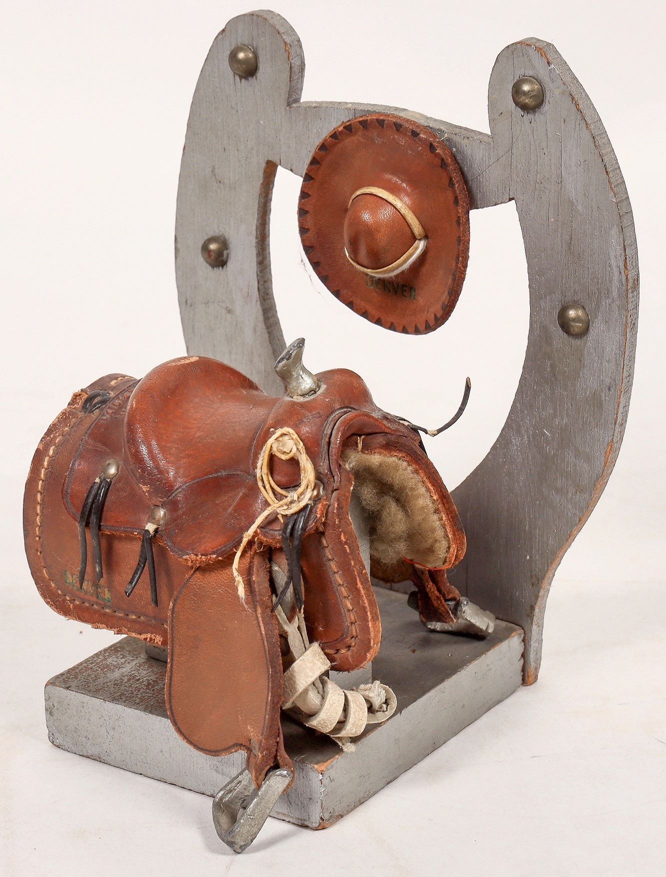 The saddle includes all of the original souvenir display which is a wood horseshoe with a cowboy hat at the top, also in leather. As a complete unit, it differs strongly from the other seen online, which does not have the complete display.