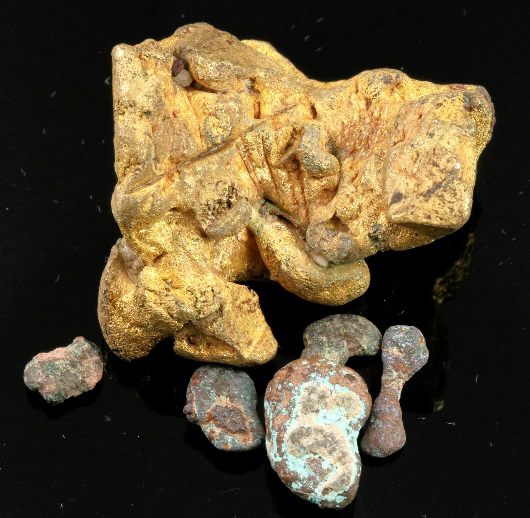 This is an incredible gold nugget found by the Nugget Ace in Goler Wash, the site of gold discovery by 1849 Death Valley Argonauts. It was originally copper coated, as are the six small nuggets with this lot, all from the same place in Goler Wash. The large nugget shows an apparent chisel cut, probably placed by an early miner, perhaps in the 1860s.