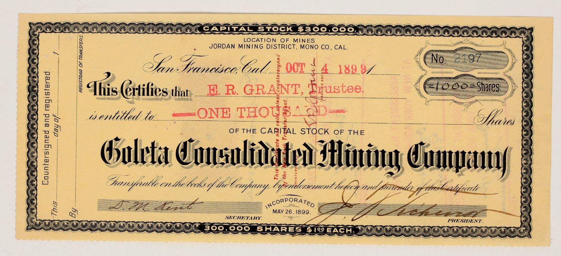 Very rare. "Location of Mines Jordan Mining District, Mono Co., Cal." printed at top center. No. 2197, issued for 1000 shares to ER Grant in 1899. Signed by president Tickenor and secretary Kent. Not cancelled. Black border and print on yellow paper. Pinholes, folds. All certificates from the Jordan District are rare, as the mines were located near the present-day ghost town of Vernon. The Walker Lake Bulletin (Aug. 8, 1883) reports that "Vernon is a prosperous camp and in one respect, is a curiosity among mining communities, as it has no saloon. This is a fault which will probably soon be corrected."