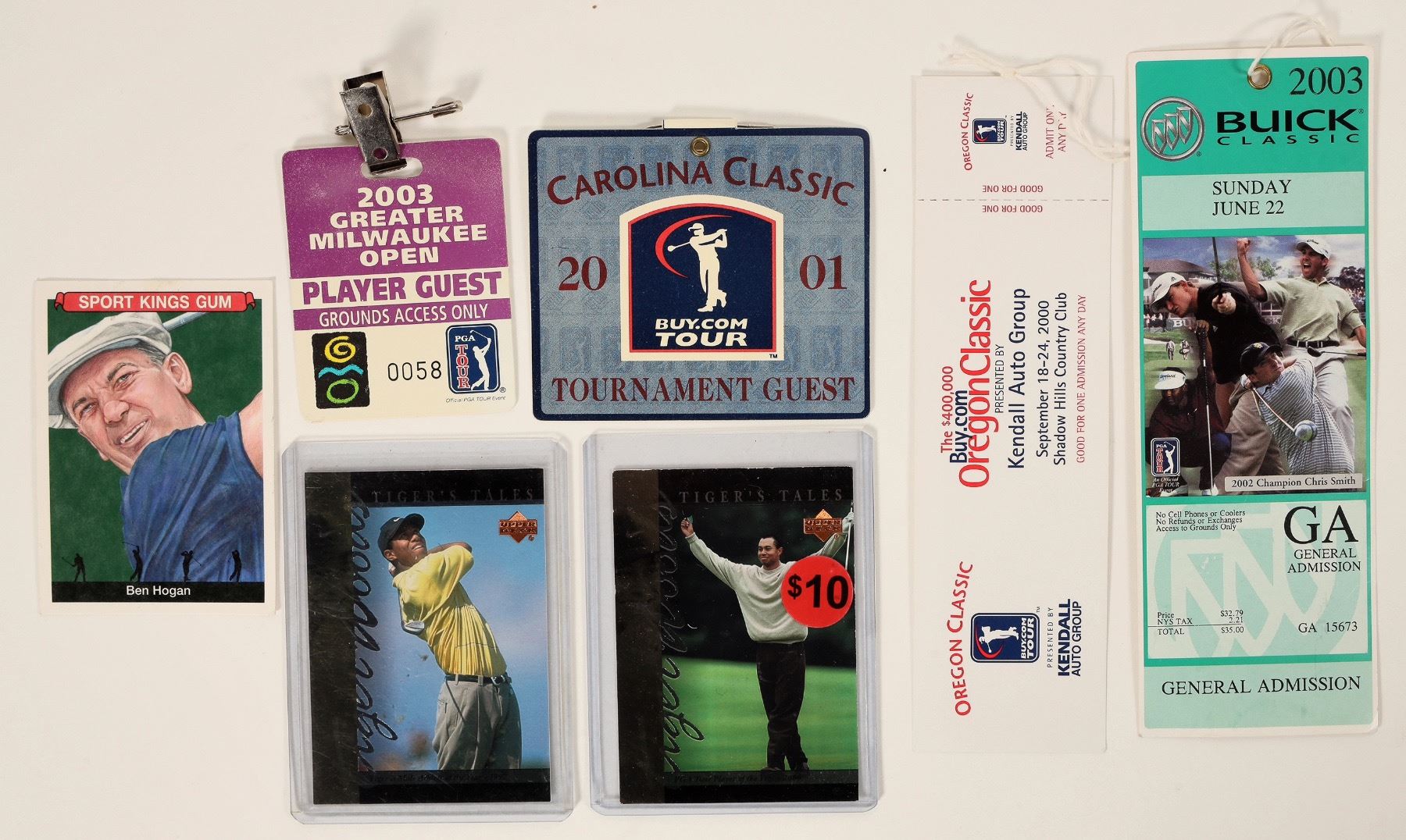 Golf ephemera includes two Tiger Woods trading cards, one Ben Hogan and passes to the 2003 Buick Classic, 2003 Milwaukee Open, The 2000 Oregon Classic and the 2001 Carolina Classic. All in good condition. Please see photos for more details.[