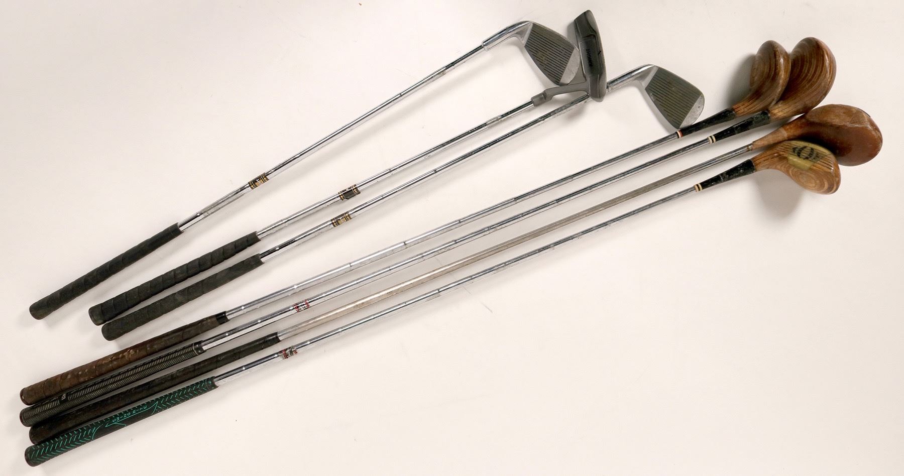 Unique set of vintage golf clubs. Including clubs from different brands: Wilson and Knight. Seven clubs total. Golf bag included!