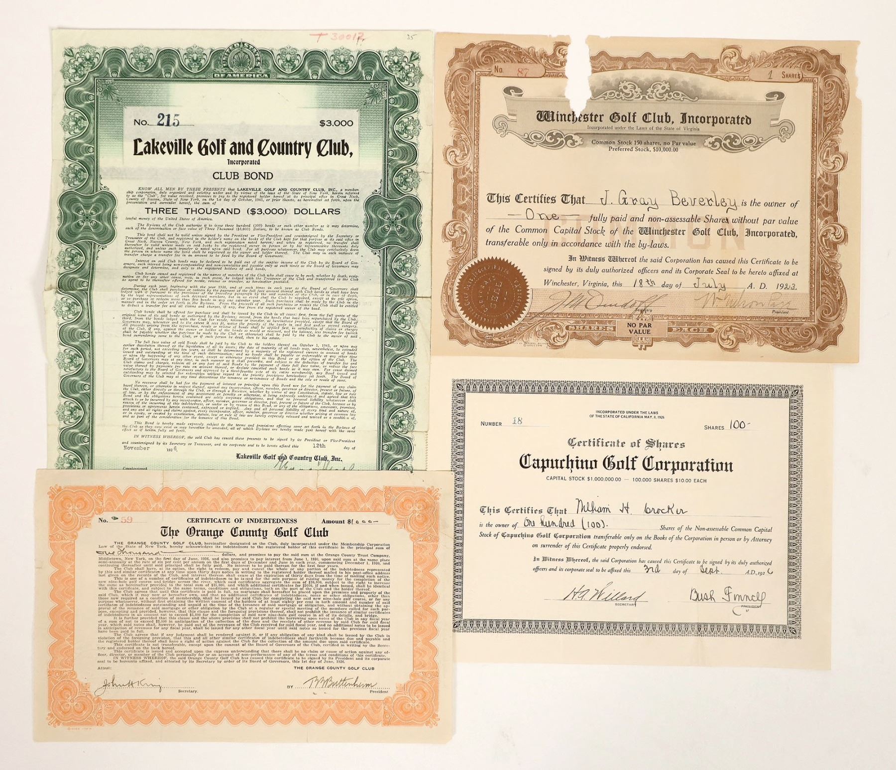 A group of four stock certificates from golf-related companies, dating from 1923 to 1926. The companies in question are Lakeville Golf and Country Club, Winchester Golf Club Incorporated, Capuchino Golf Corporation, and the Orange County Golf Club. All are signed by the secretary and president of their respective companies, and three of the four are stamped with their company's seal. The Winchester certificate has a significant tear on the top edge.