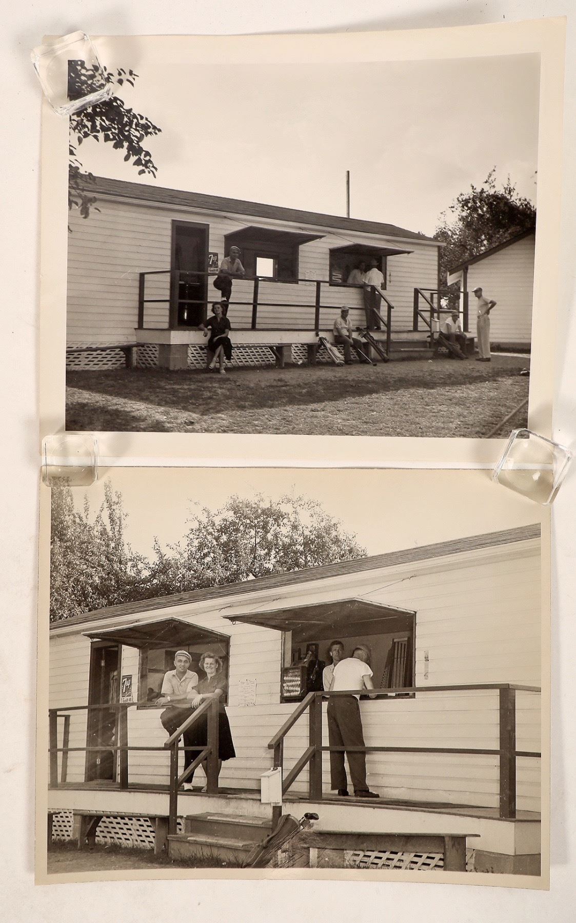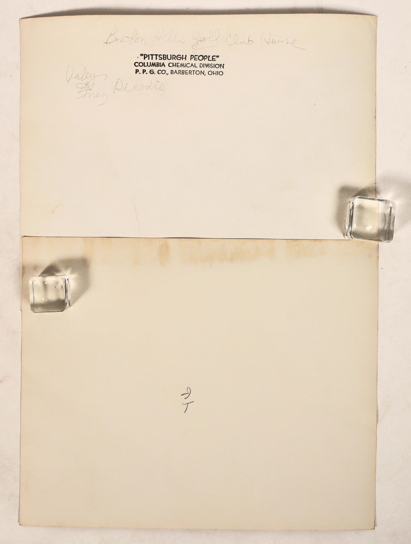 Two vintage black and white photos of golf players in front of a golf club house (a shack for distributing clubs and balls to players) on the Boston Hills County Club in Hudson, Ohio. The reverse side of one photo bears the text: "Pittsburgh People", Columbia Chemical Division, P.P.G. & Co., Barberton, Ohio. The title "Pittsburgh People" likely refers to 'P.P.G. & Co.', the Pittsburgh Plate Glass Company, perhaps indicating that the pictured individuals are employees.[ Hudson Ohio