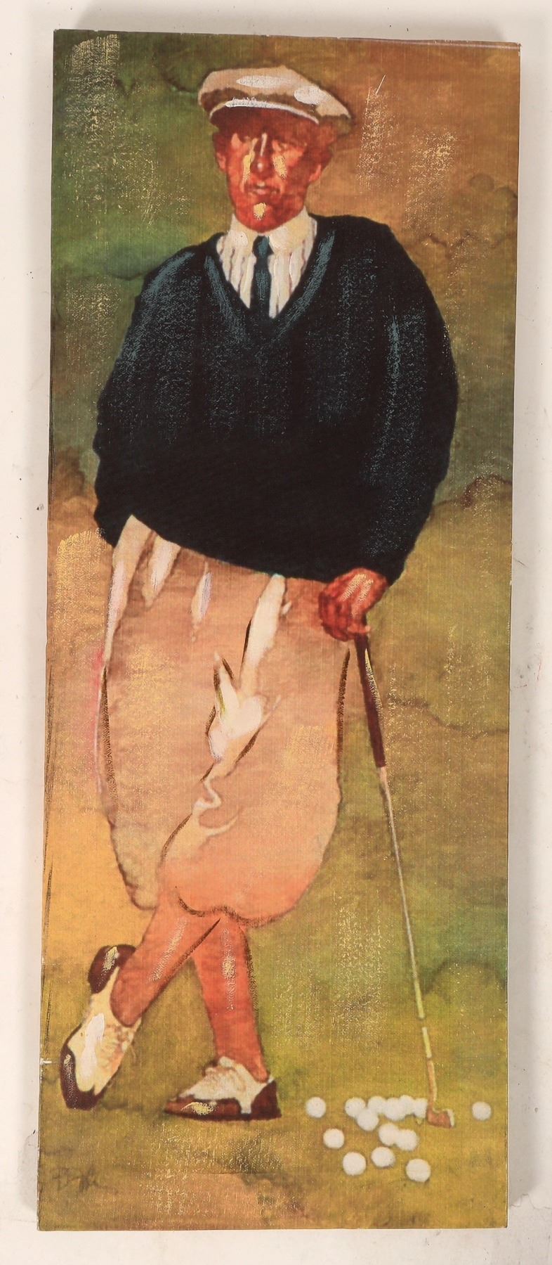 Reproduced painting of a golfer. It measures 9"x 24" and is on thin canvas. In nice condition. Please see photos for more details.[