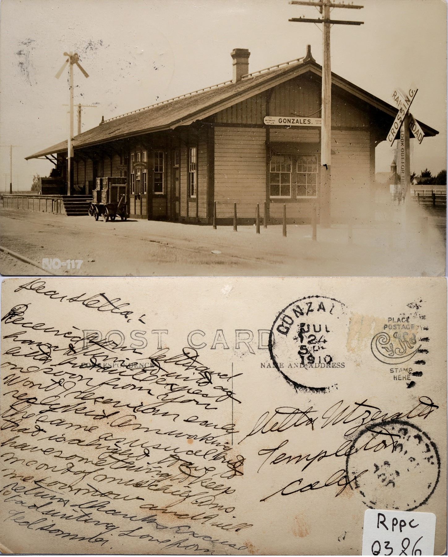 Real photo postcard of Railroad Station; Black white, image of Depot, "No. 117, Gonzales" California; Postmark cancellation July 24, 1901; Building image, one story, rail crossing;/ Train stop was on the original Short Line of Southern Pacific route from New Orleans.