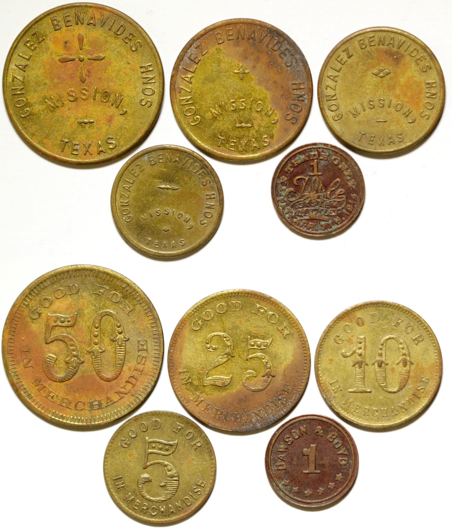 Set of four tokens from Gonzalez Benavides Hnos: 5c, 10c, 25c, 50c GF in merchandise. Also an Ingle token from Dawson & Boyd. State: Texas City: Mission Date: HWAC# 82475