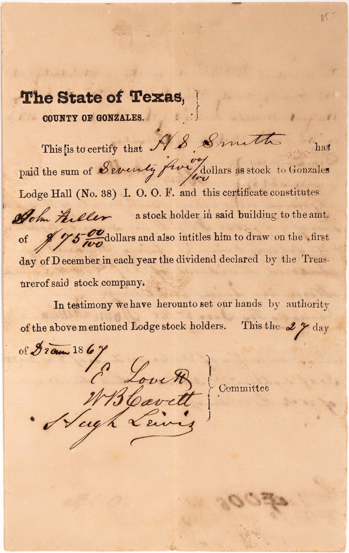 The State of Texas, County of Gonzales. Seventy-five dollars ($75) was paid to Gonzales Lodge Hall No. 38, I.O.O.F. and this certificate constitutes John Fuller a stock holder in said building and entitles him to a dividend each December. Document is dated Dec. 1867. Signed by the three members of the committee. Some of the dividends are signed off on the back. Uncanceled.