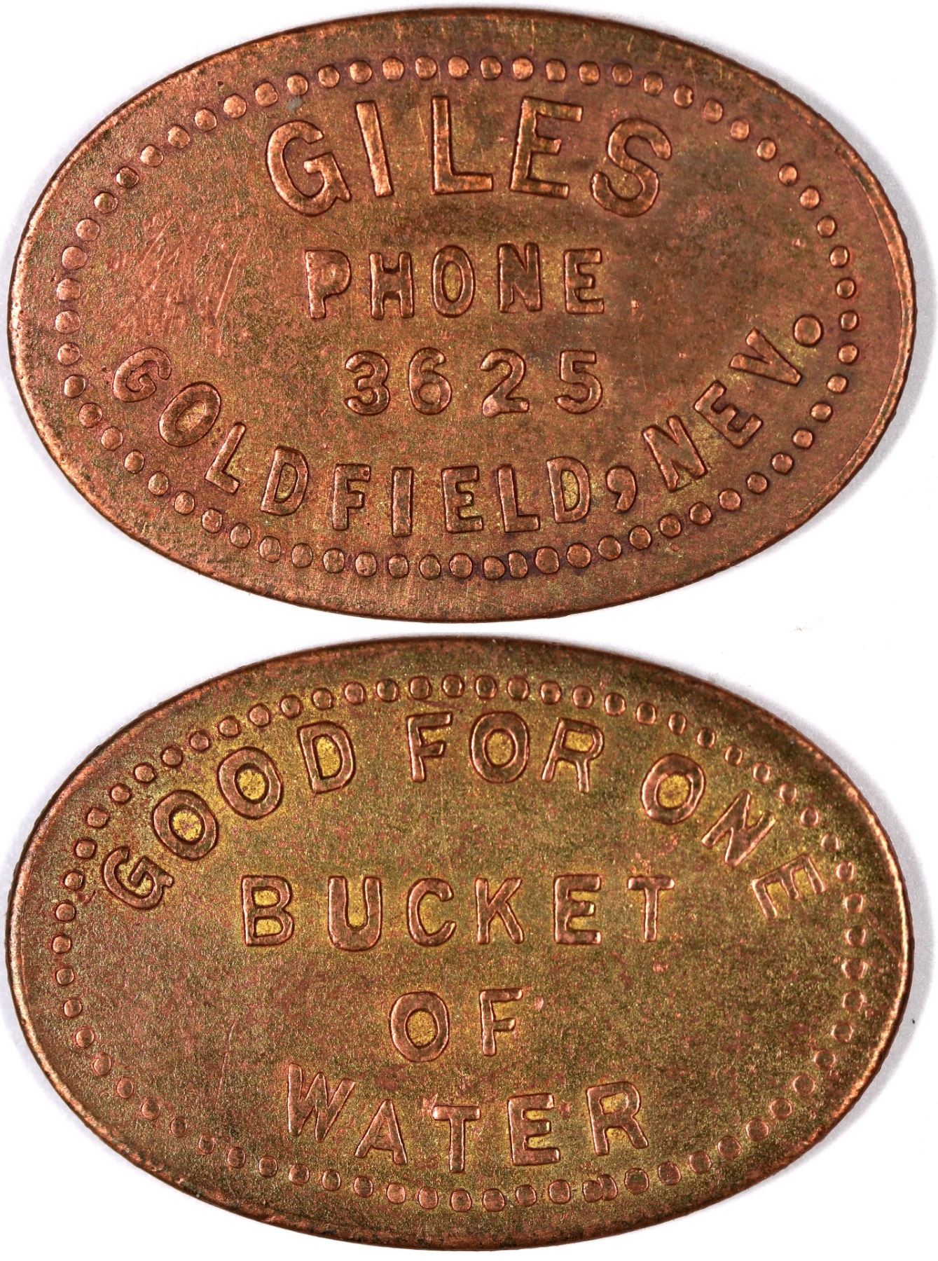 Ultra rare, 2nd of the three known. Obv.: Giles / Phone / 3625 / Goldfield, Nev.; Rev.: Good For One / Bucket / Of / Water. Br., oval,26 x 17 mm.